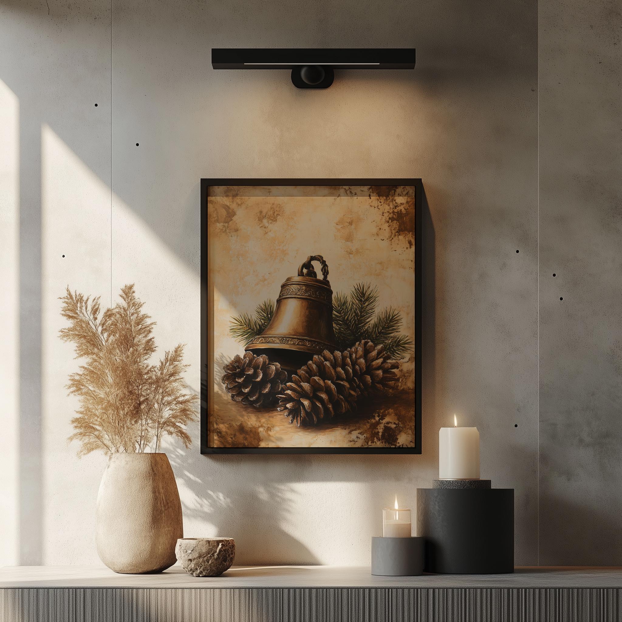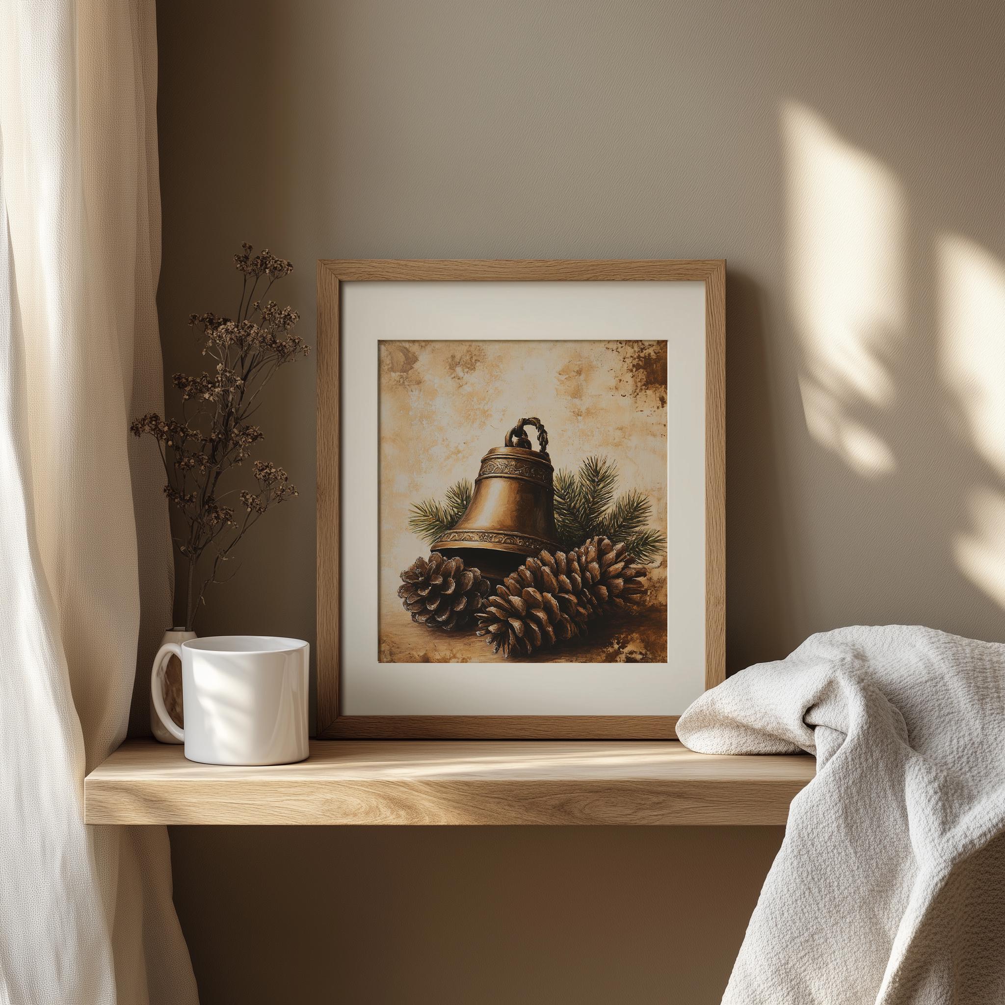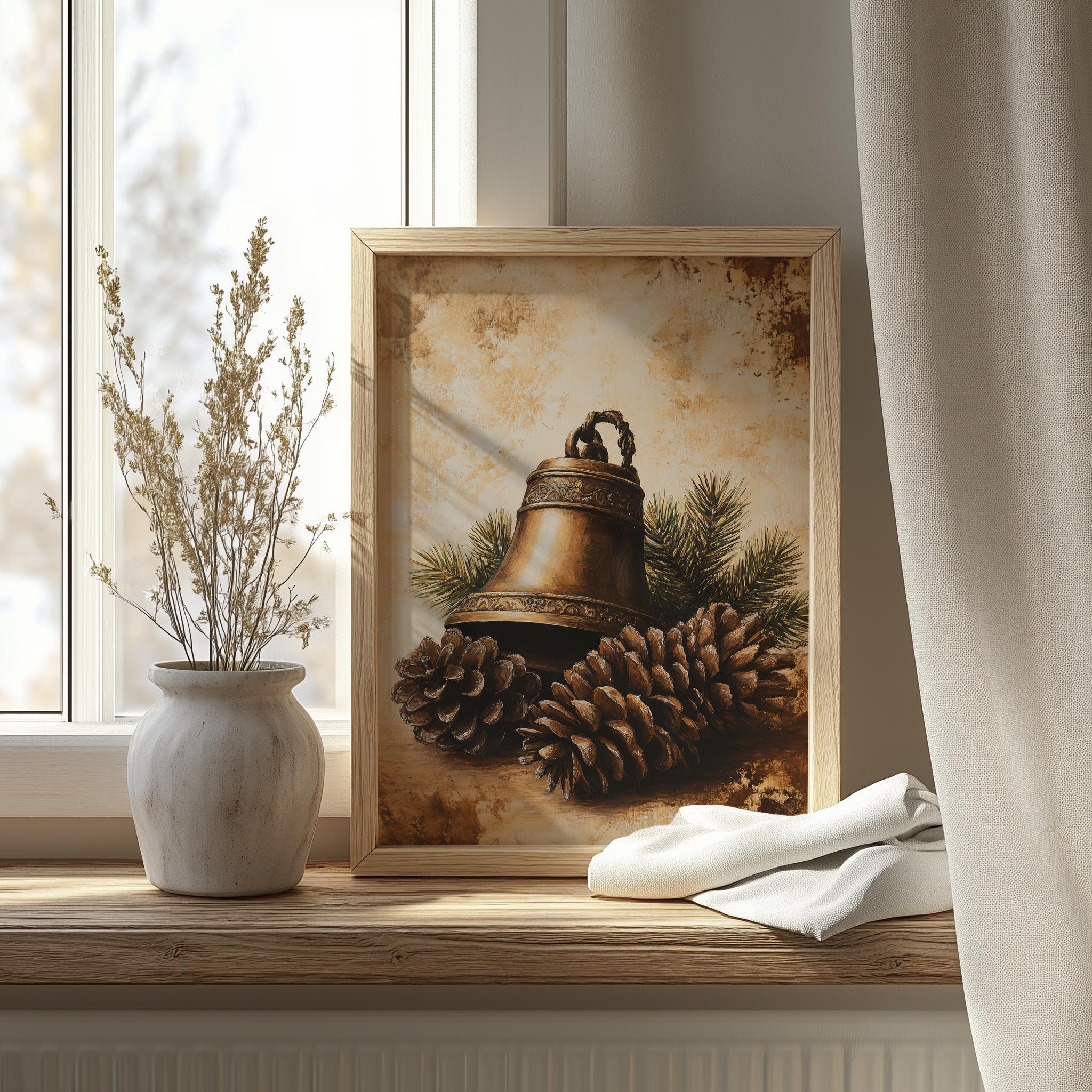 Rustic Christmas Brass Bell Painting - A Captivating Vintage Holiday Wall Art Piece This enchanting artwork captures the essence of a cozy winter season, featuring a beautifully detailed brass bell surrounded by charming pinecones. Perfect for adding a touch of rustic charm to your home decor, this printable piece evokes the warmth and nostalgia of vintage Christmas celebrations. Ideal for farmhouse-style interiors and cottagecore aesthetics, it brings a festive spirit to any space. Celebrate the joy of winter with this delightful piece, perfect for the holiday season.
