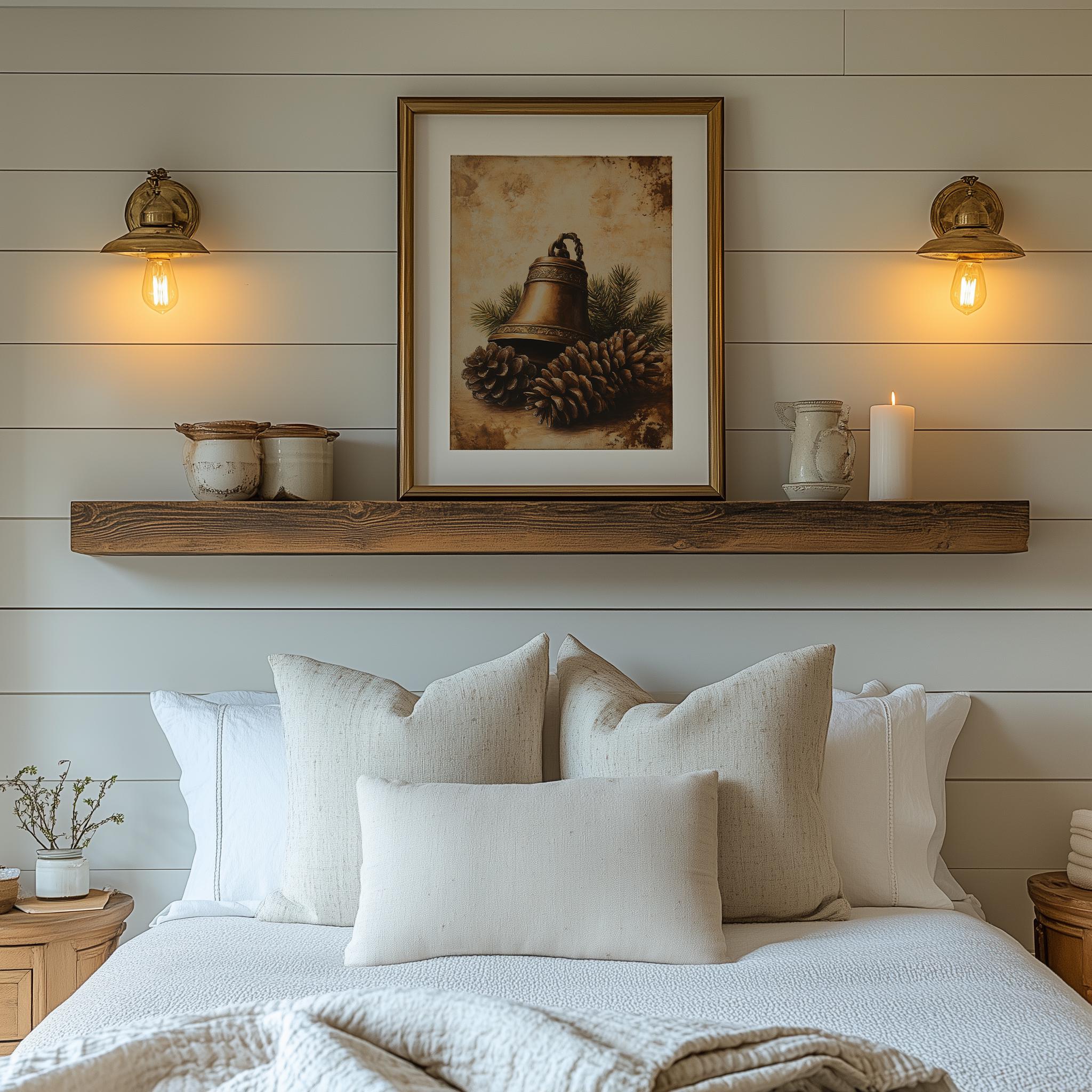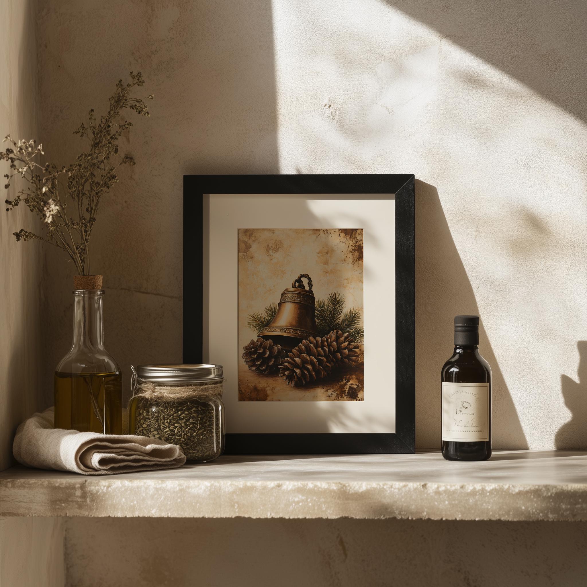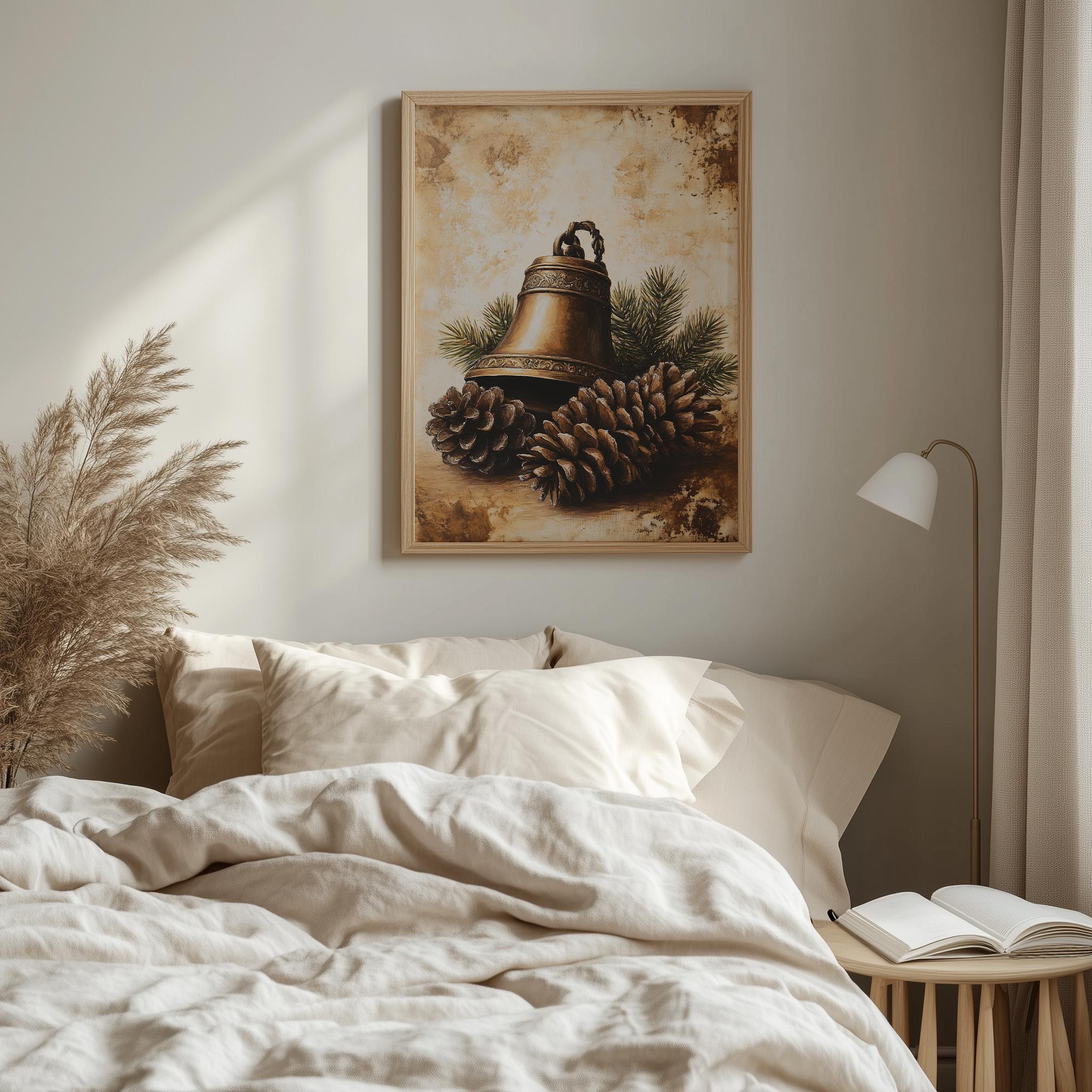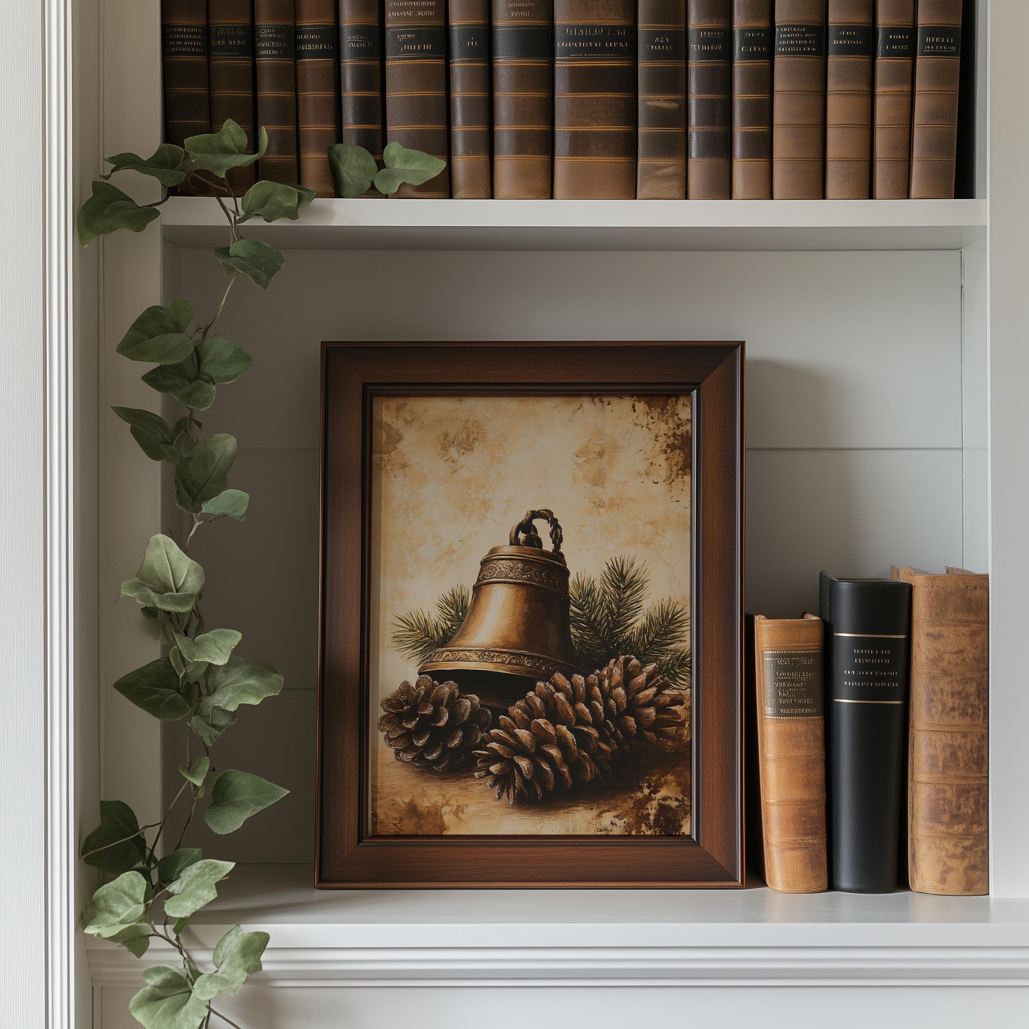 Rustic Christmas Brass Bell Painting - A Captivating Vintage Holiday Wall Art Piece This enchanting artwork captures the essence of a cozy winter season, featuring a beautifully detailed brass bell surrounded by charming pinecones. Perfect for adding a touch of rustic charm to your home decor, this printable piece evokes the warmth and nostalgia of vintage Christmas celebrations. Ideal for farmhouse-style interiors and cottagecore aesthetics, it brings a festive spirit to any space. Celebrate the joy of winter with this delightful piece, perfect for the holiday season.