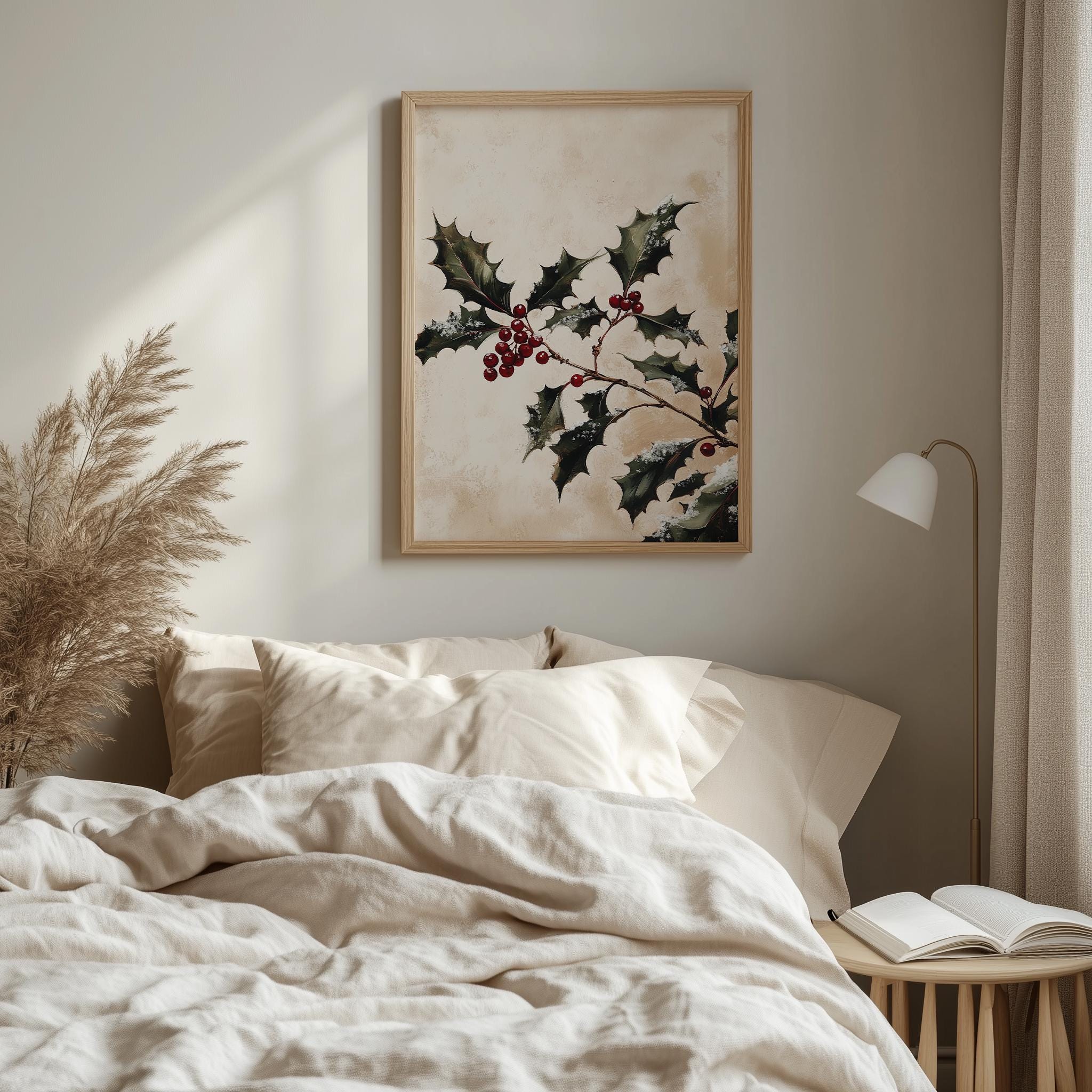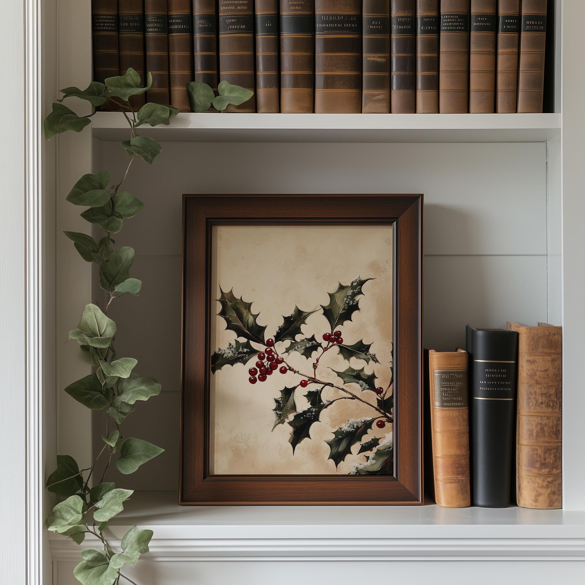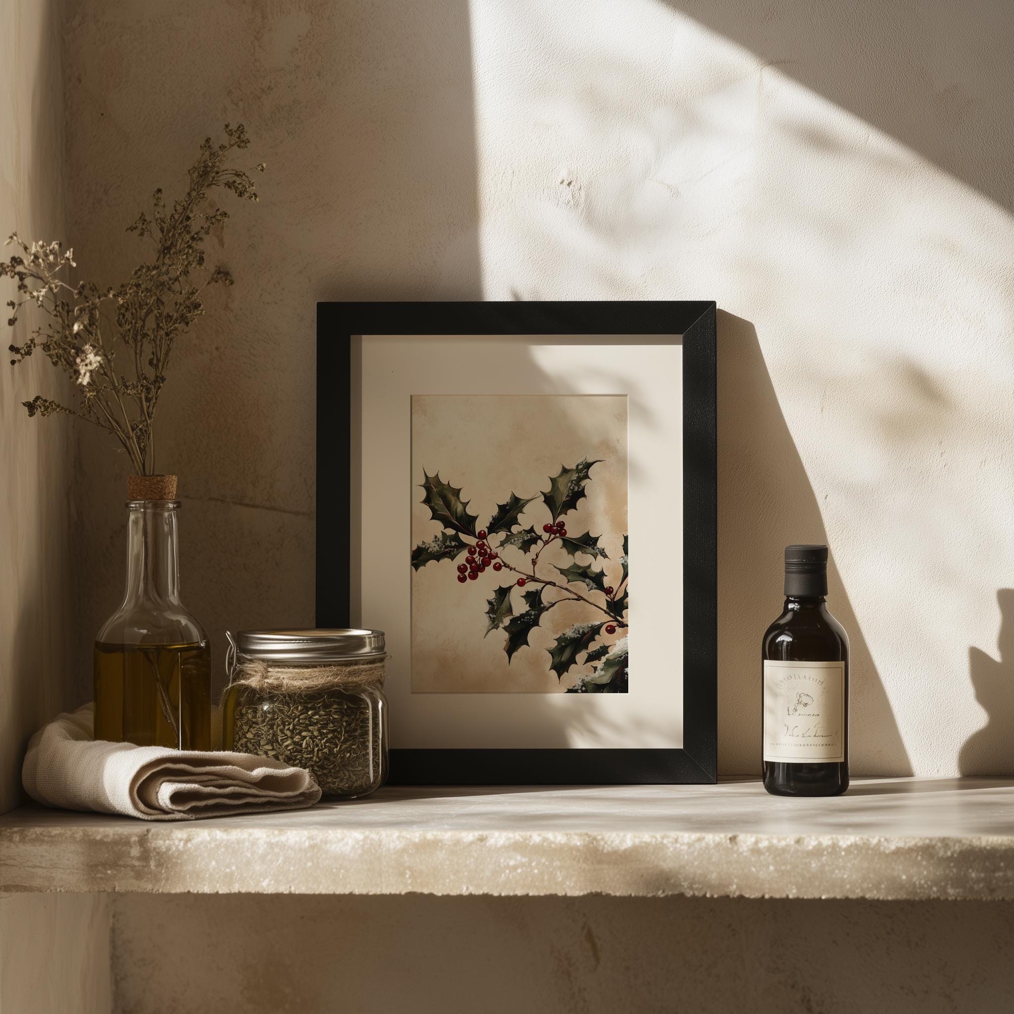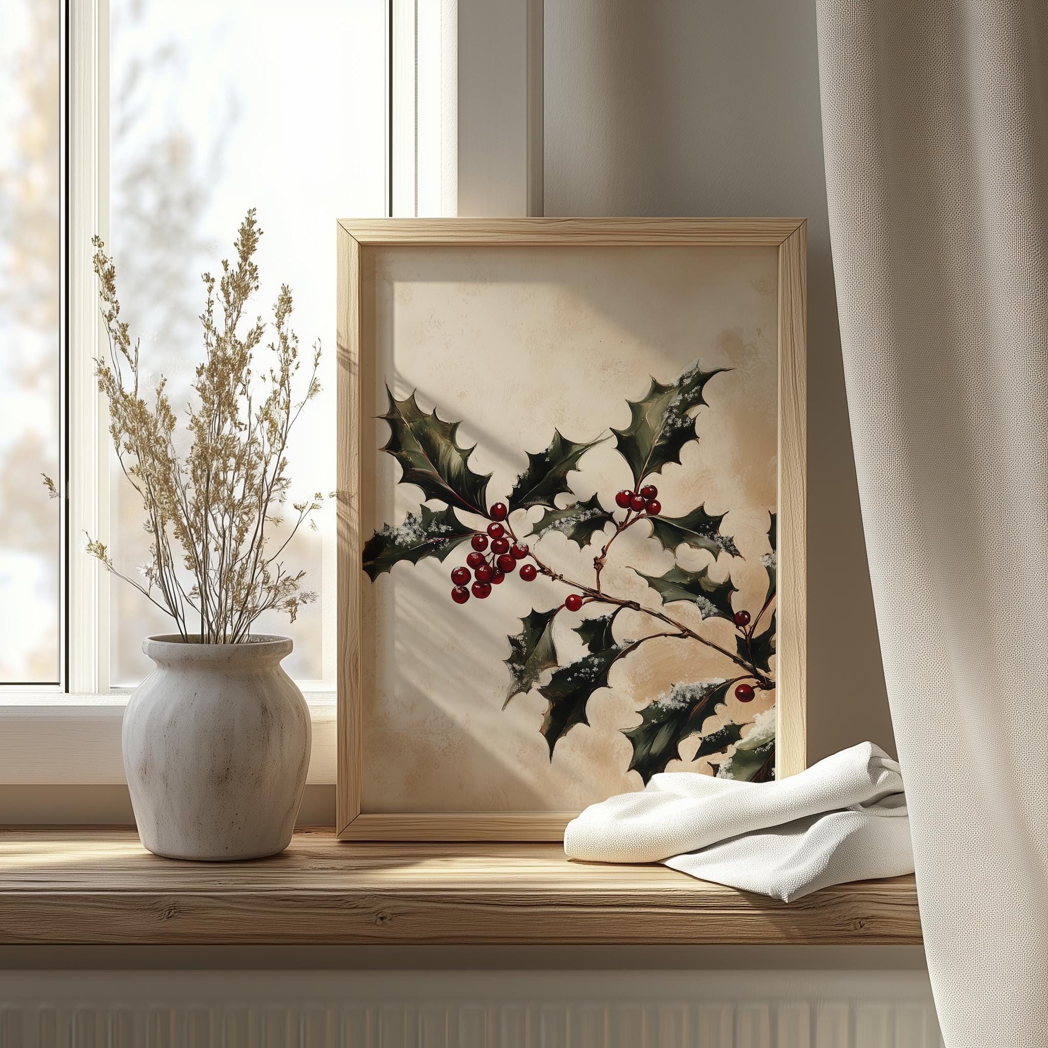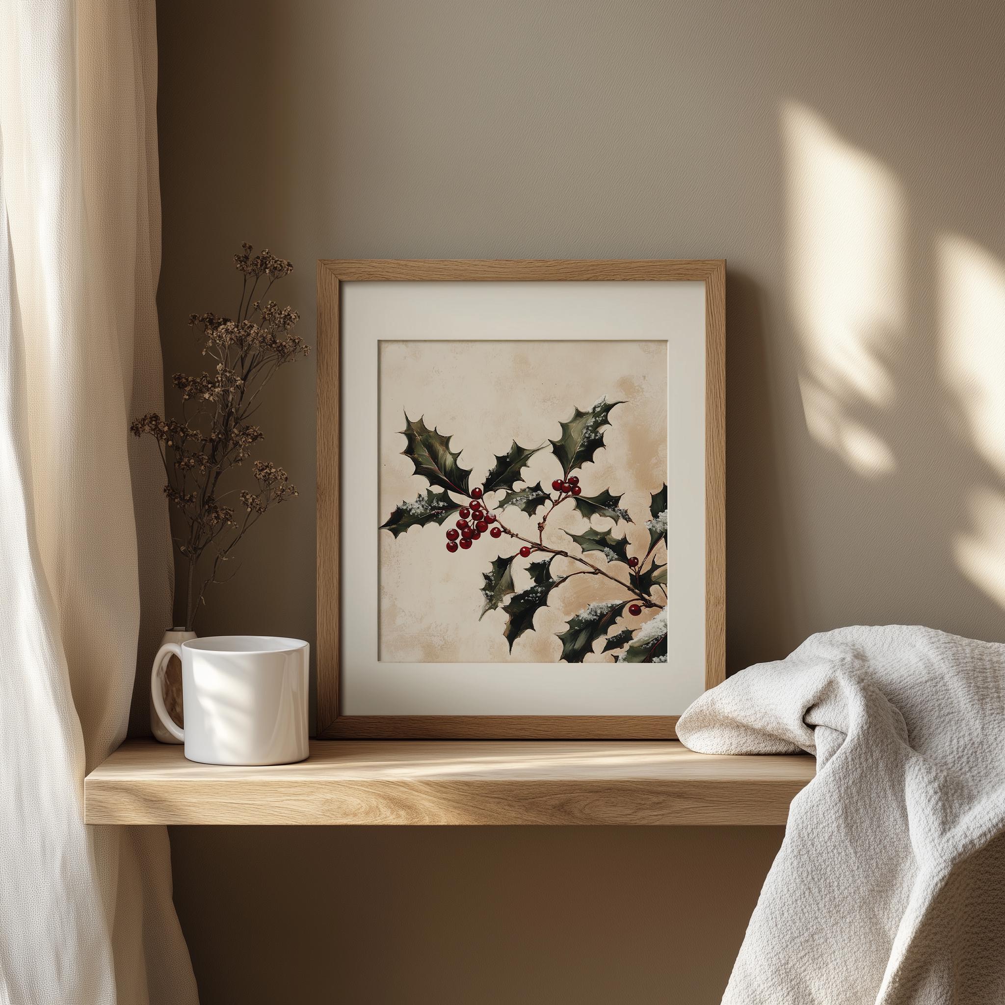 Classic Holly Sprig Painting - Vintage Holiday Wall Art This enchanting piece captures the essence of the festive season with its intricate depiction of holly leaves, making it a perfect addition to your holiday decor. The rustic charm and cottagecore style of this printable art will bring warmth and cheer to any space, whether displayed in your living room, kitchen, or as part of your winter-themed gallery wall. Perfect for the winter holidays and festive celebrations.
