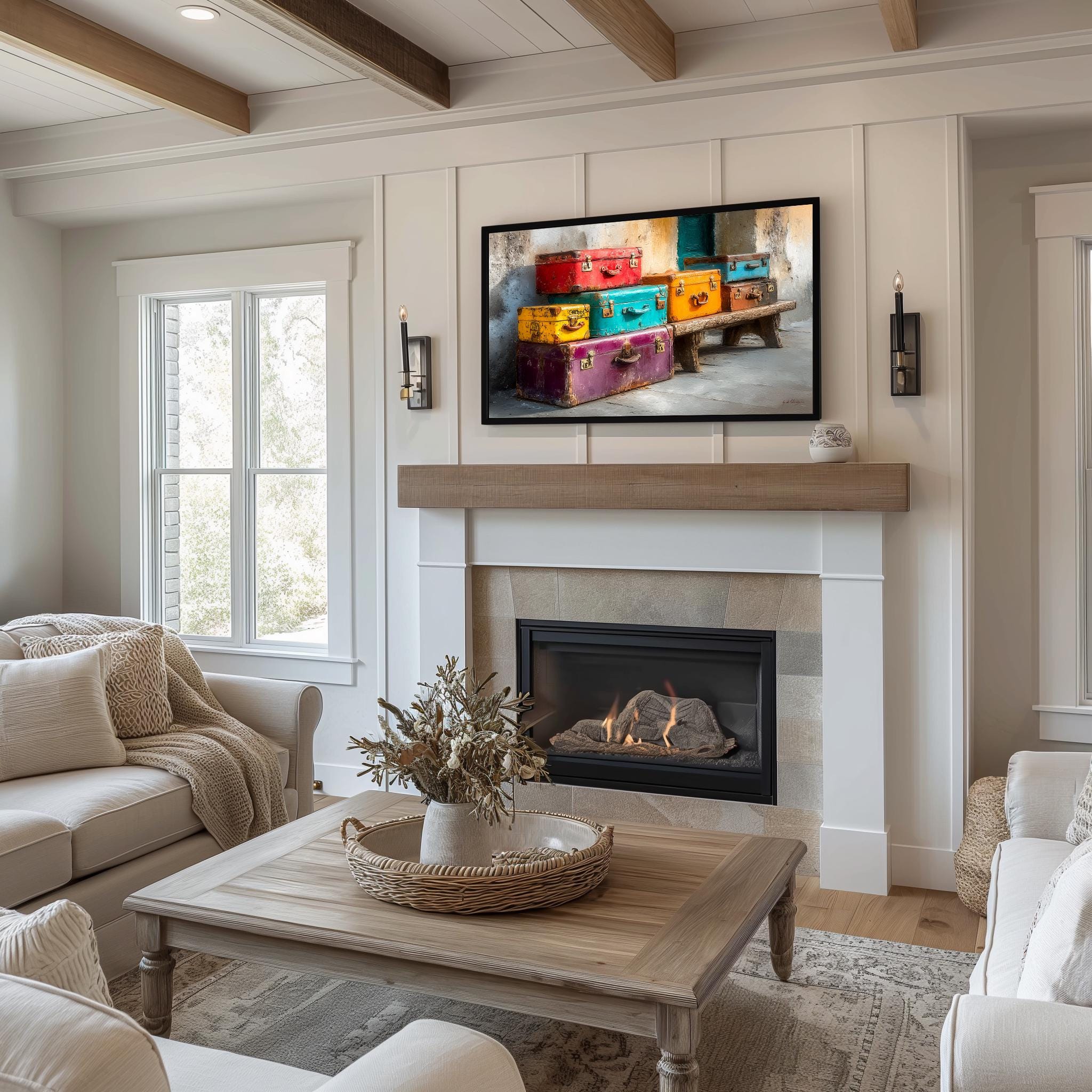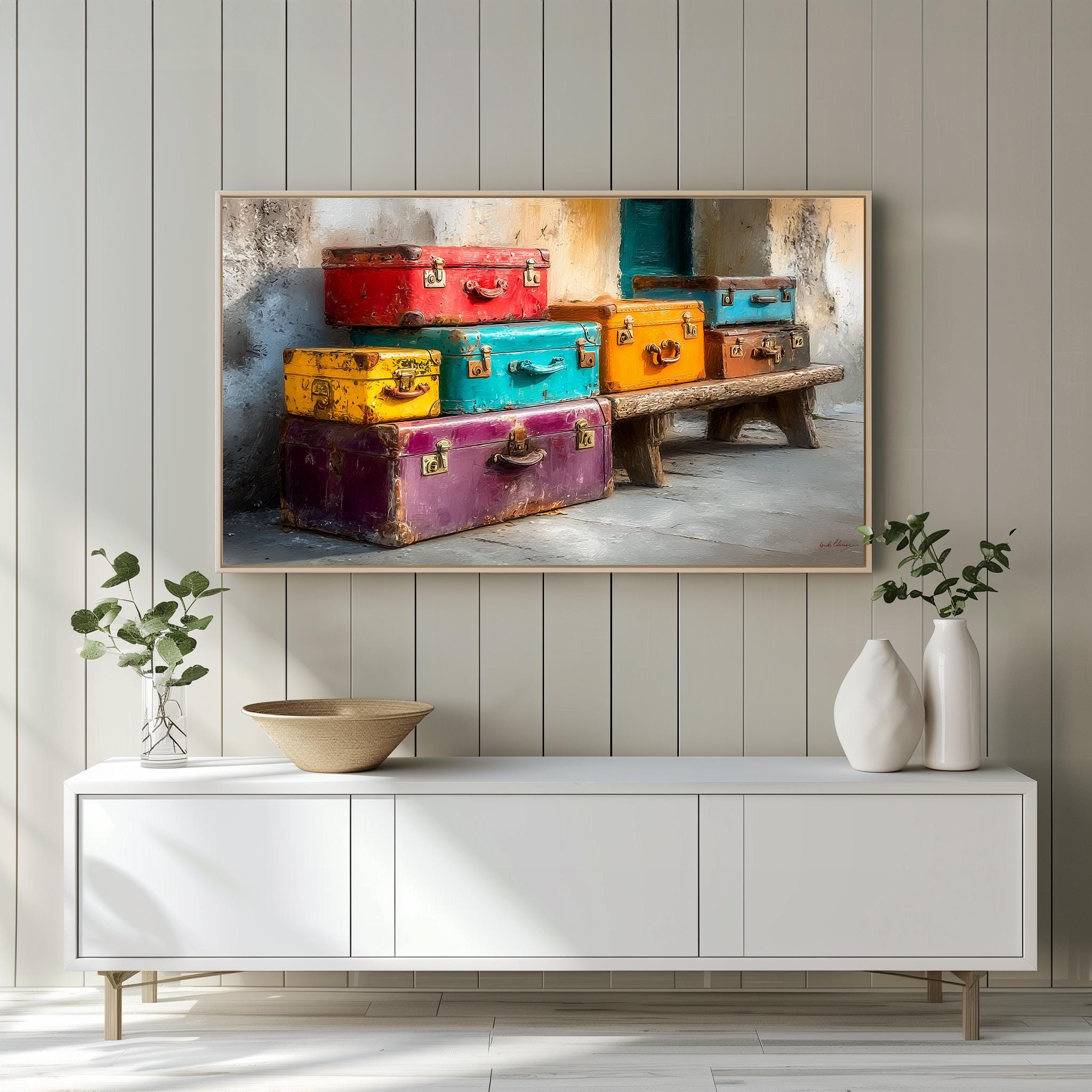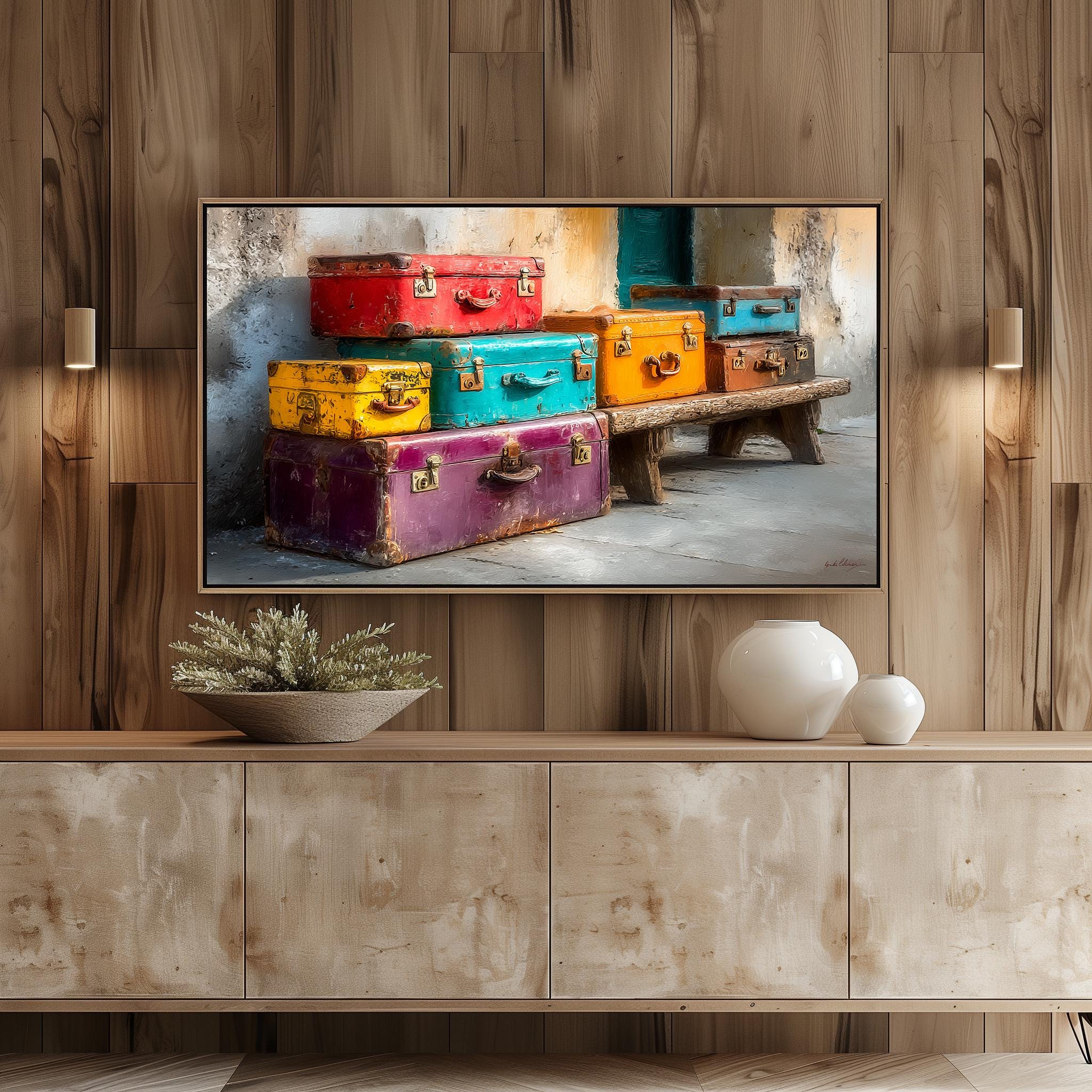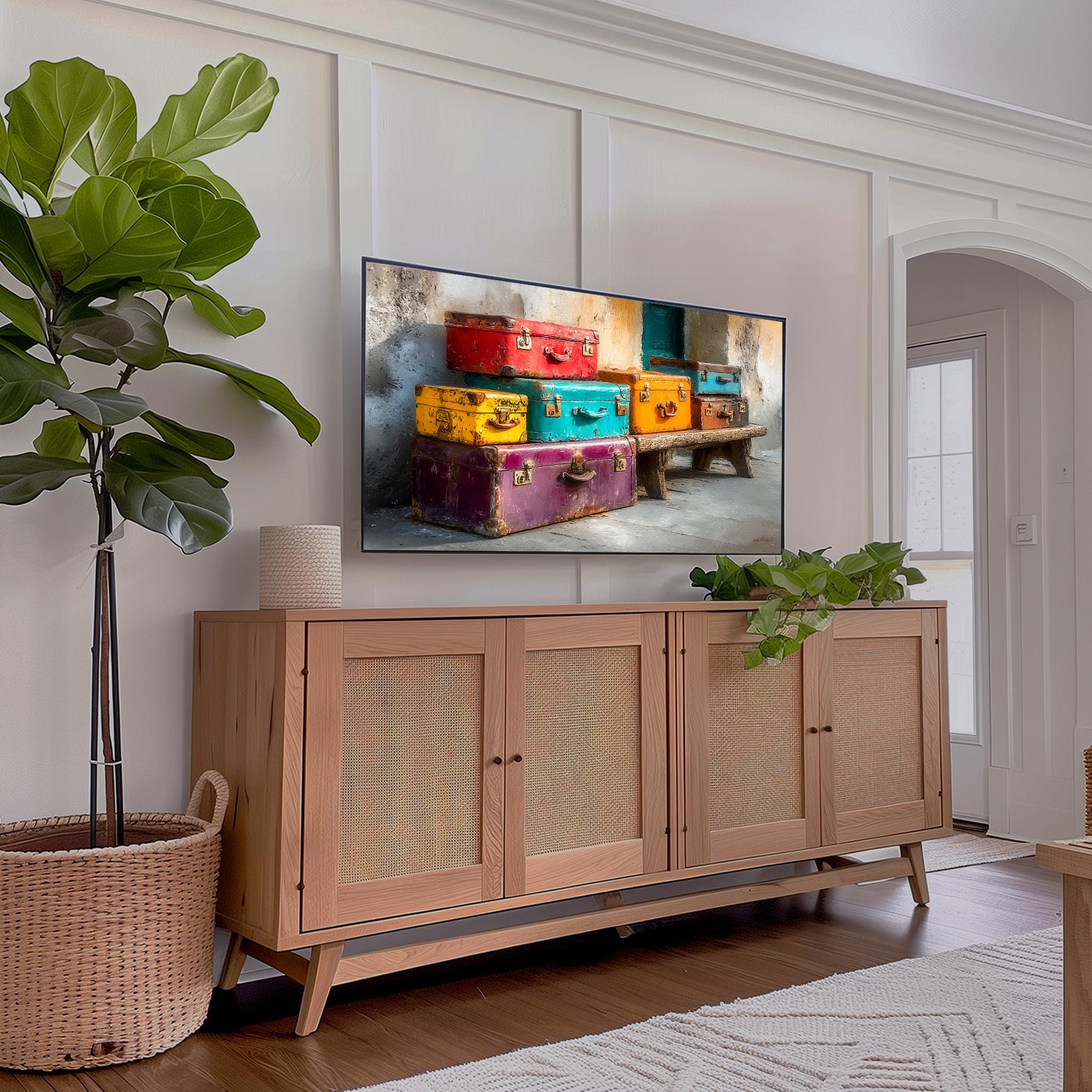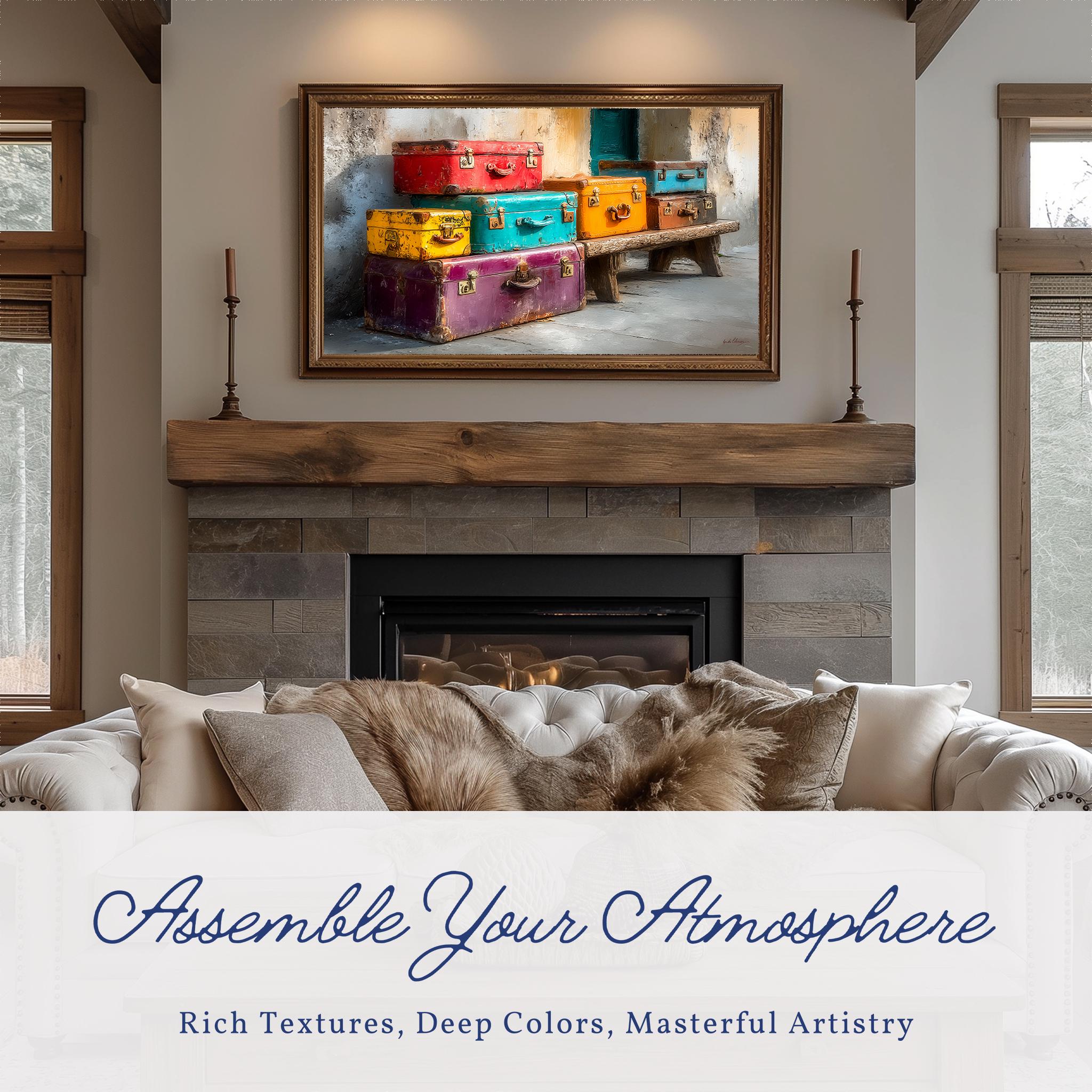 Vintage Suitcases Frame TV Art: A Whimsical Journey Through Time Transform your living space with our Vintage Suitcases Frame TV Art, a colorful digital download that brings the essence of retro travel into your home. Inspired by the charm of train stations and the nostalgia of classic voyages, this unique artwork is designed specifically for your Samsung Frame TV, adding a pop of color and a touch of wanderlust to your decor. Perfect for lovers of vintage and rustic aesthetics, this art print is sure to spark conversations and fill your walls with stories. Ideal for year-round decor, bringing warmth and inspiration to every season.