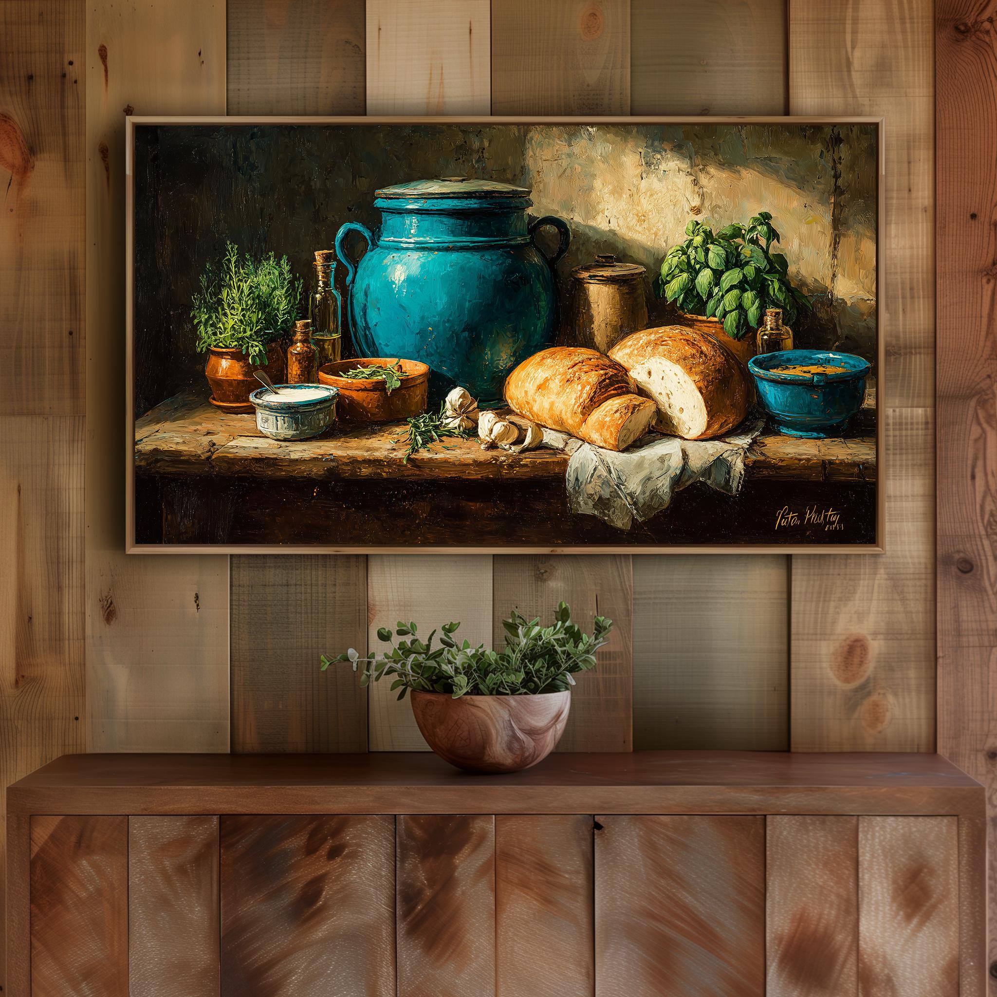 Rustic Kitchen Scene Frame TV Art, Fresh Bread and Herbs Painting for TV, Samsung Frame TV Decor, Farmhouse Wall Art, Digital Download 393