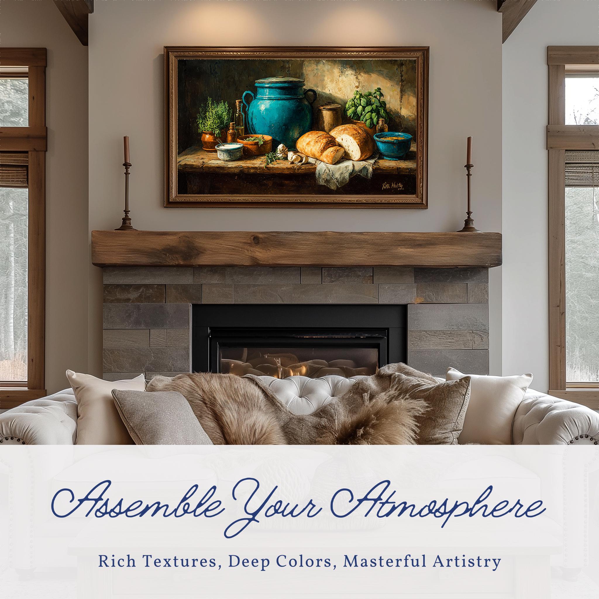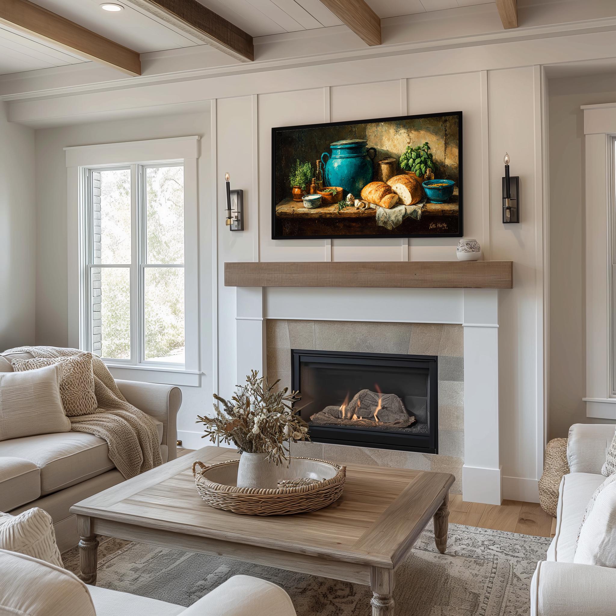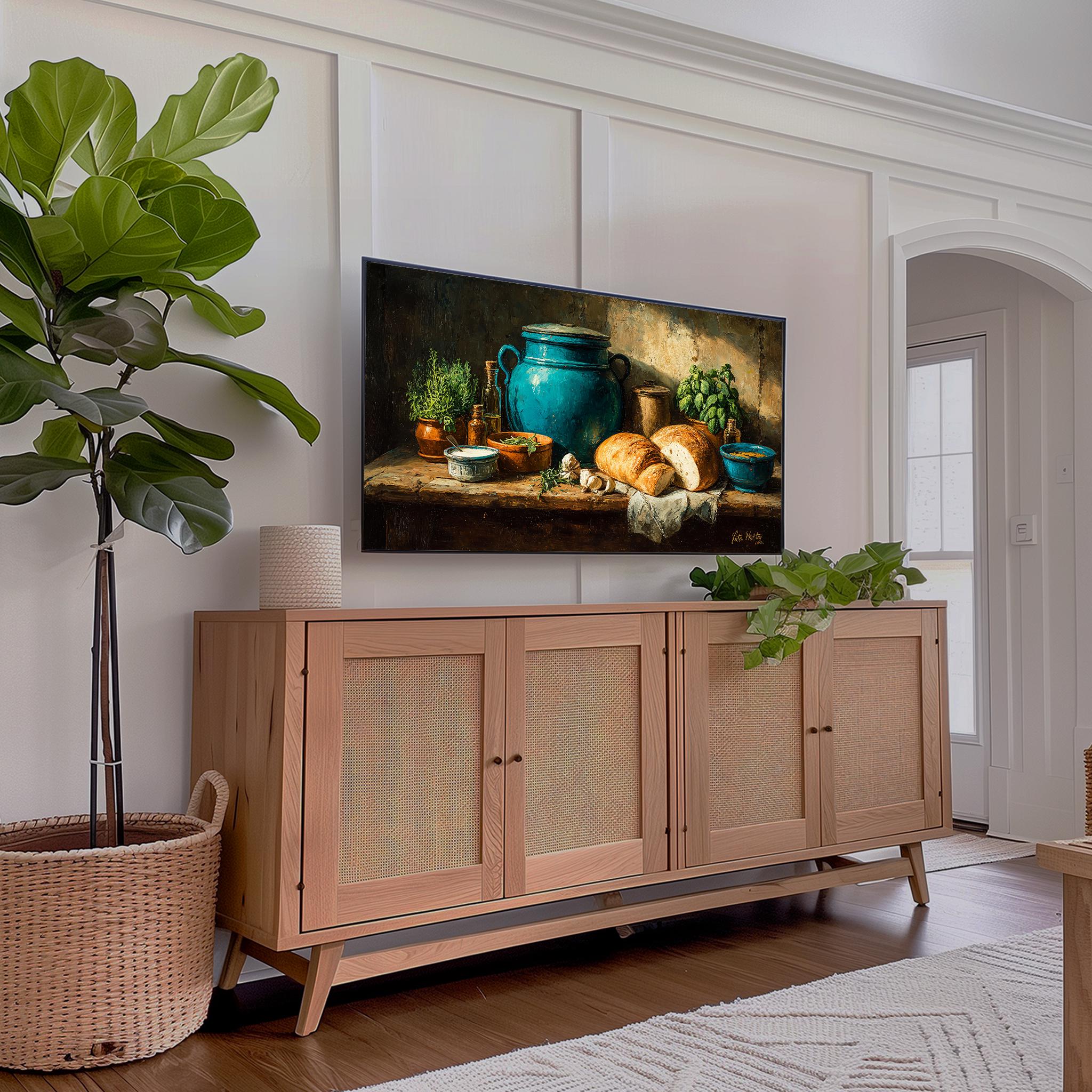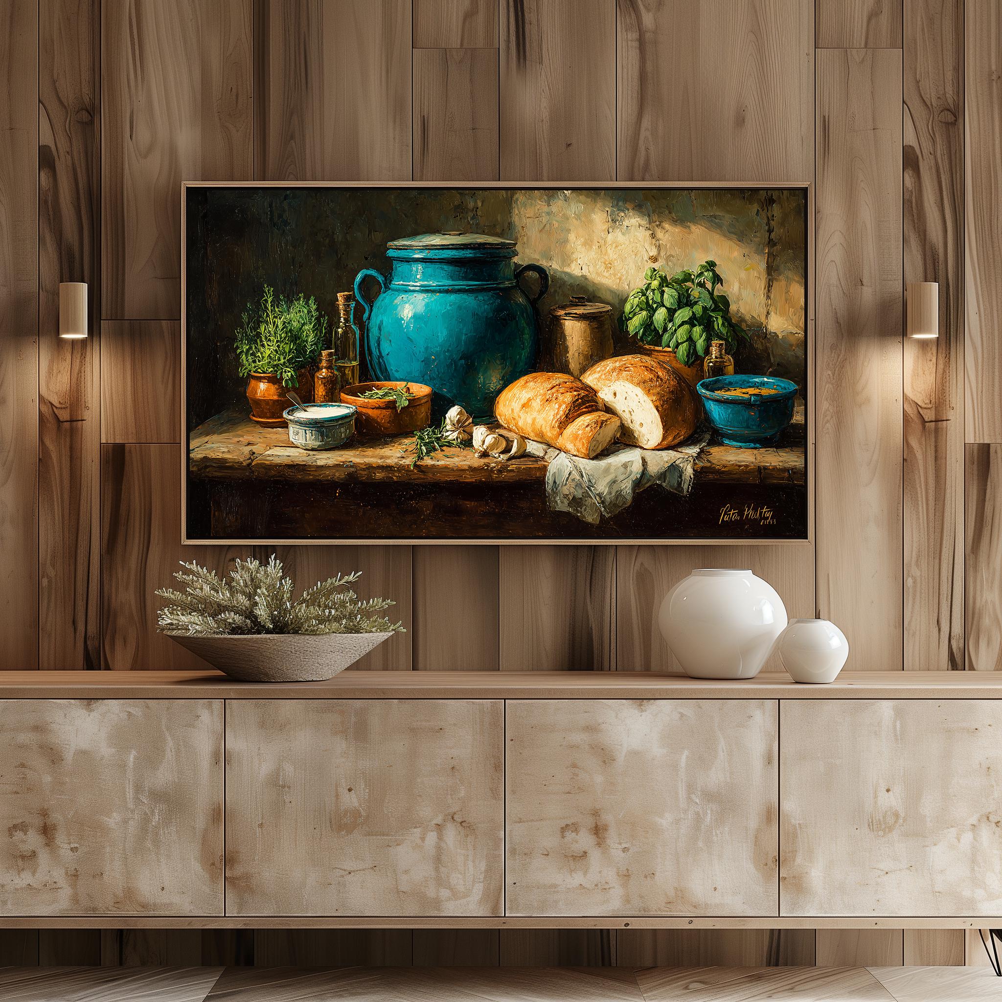 Rustic Kitchen Scene Frame TV Art featuring Fresh Bread and Herbs Transform your living space with this enchanting digital download of a rustic kitchen scene. Perfectly designed for your Samsung Frame TV, this artwork brings warmth and charm to your home with its depiction of fresh bread and vibrant herbs. Ideal for farmhouse aesthetics, this piece adds a touch of country style to your decor. Embrace the cozy vibes of autumn with this charming piece that complements seasonal gatherings and culinary delights.