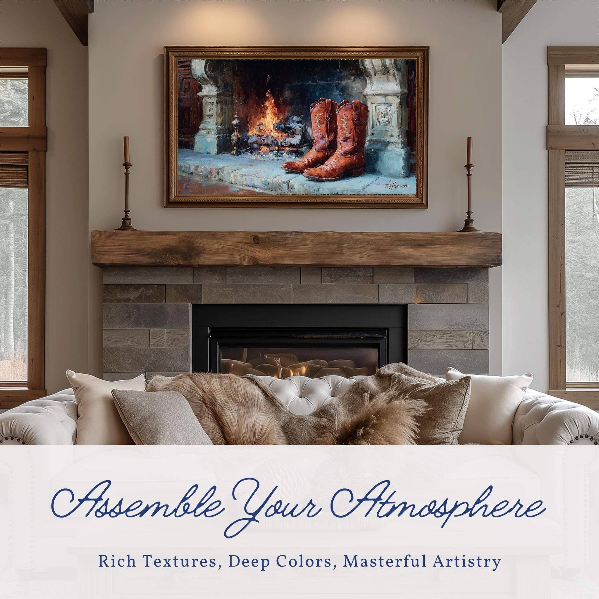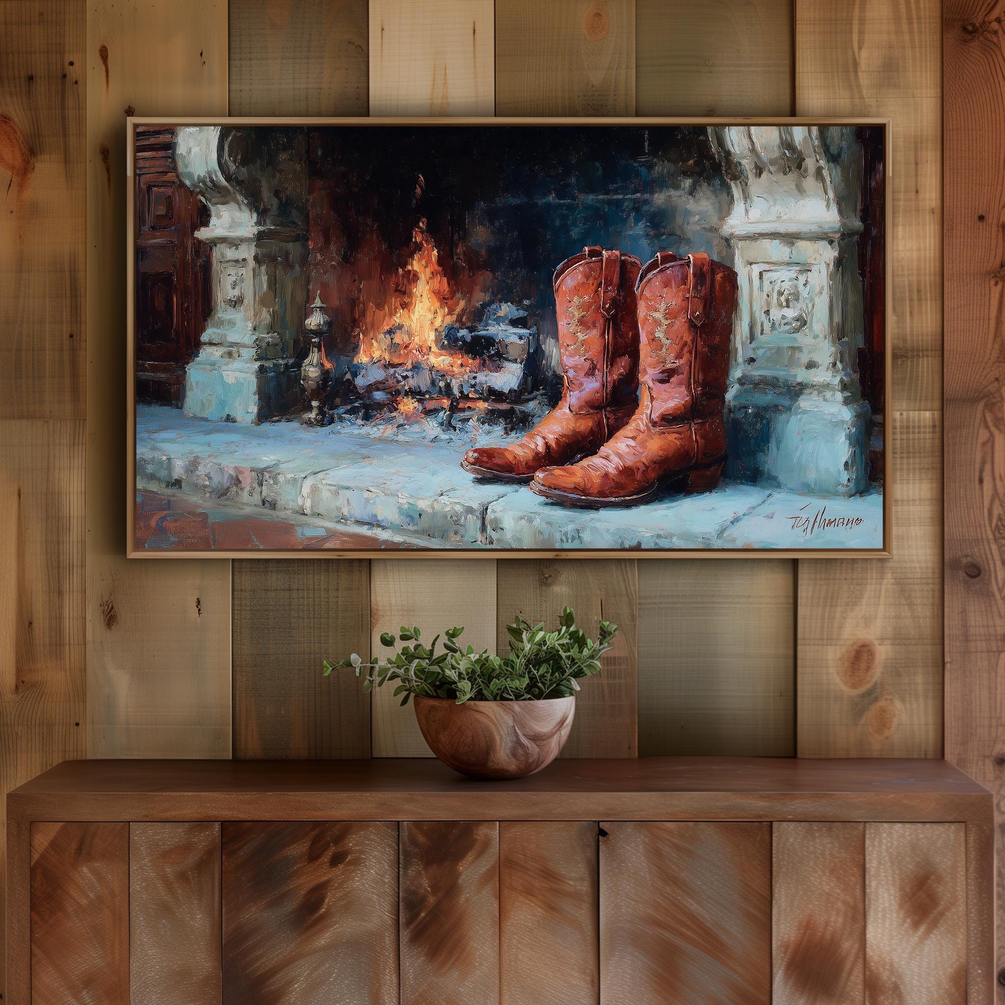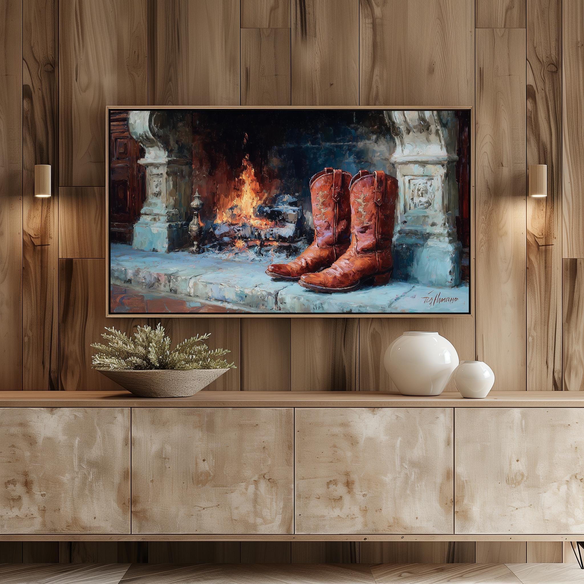 Rustic Fireplace Boots Samsung Frame TV Art, Cozy Winter Scene TV Artwork, Cottage Fireplace Decor for Frame TV, Digital Download 390