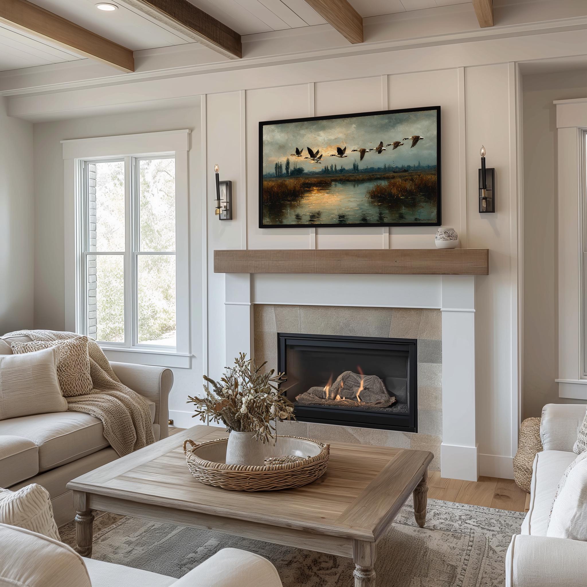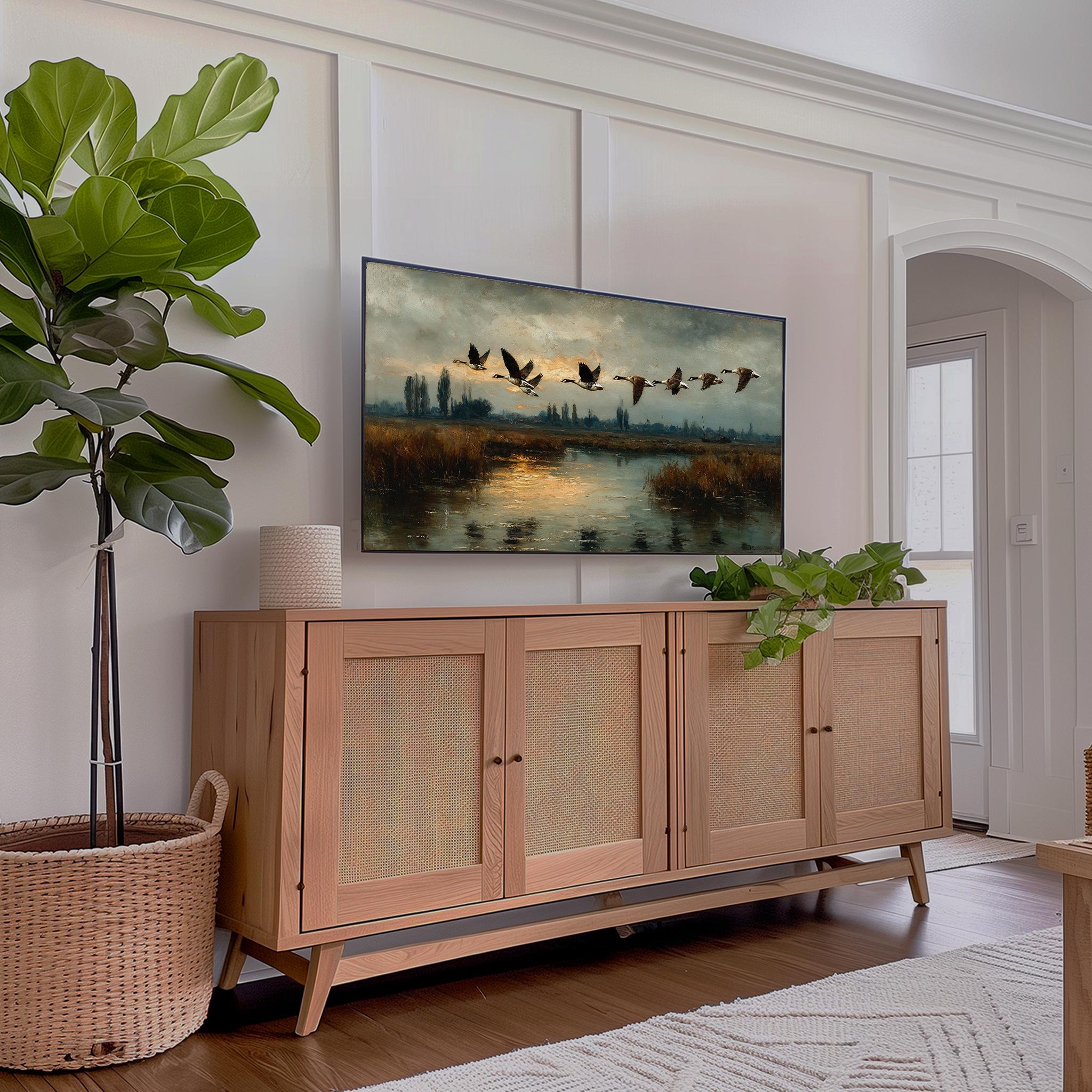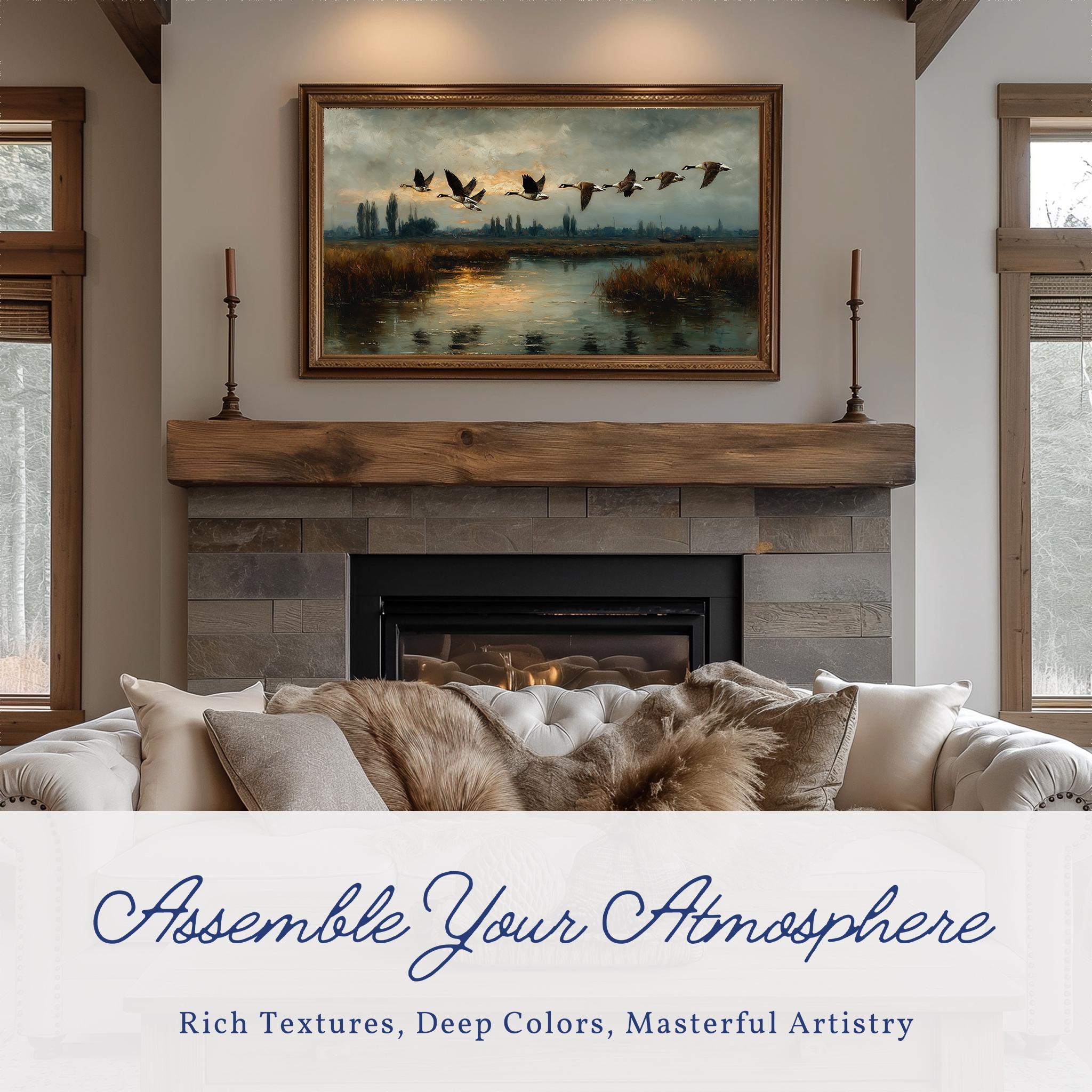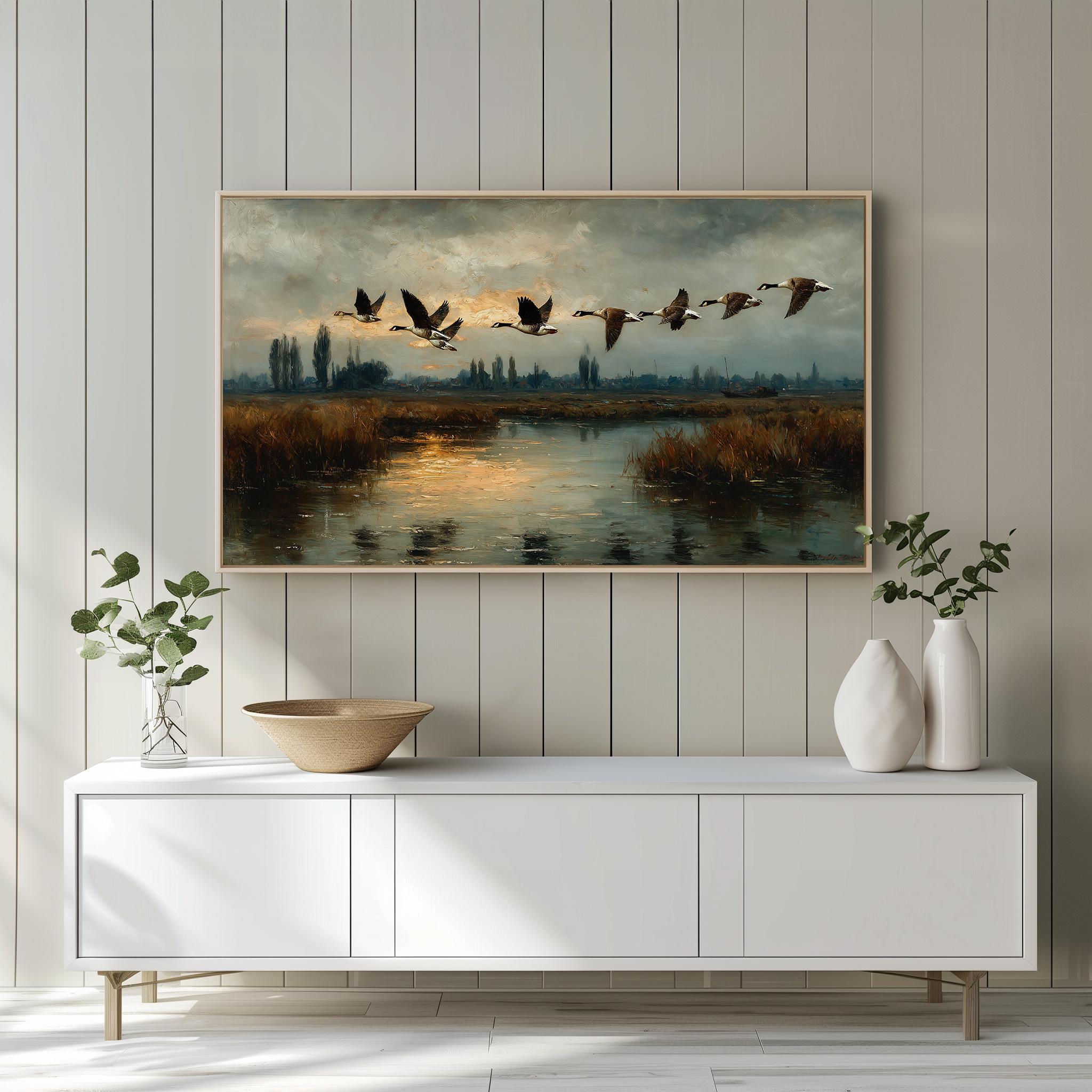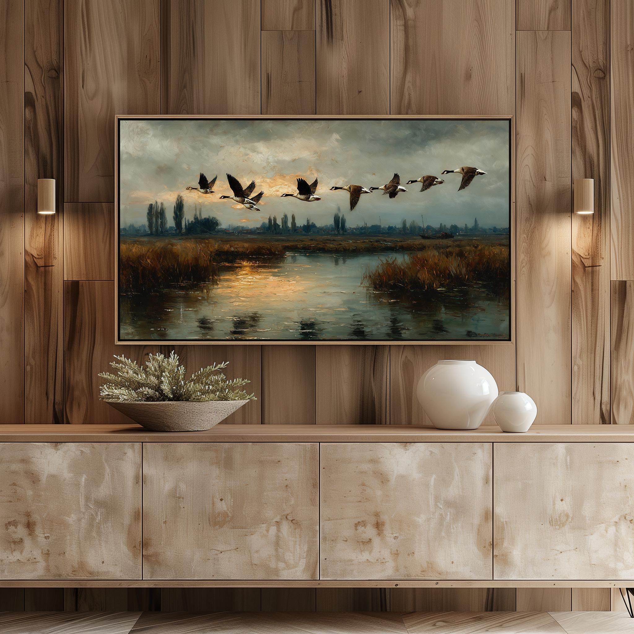 Rustic Geese Flock at Dawn Frame TV Art - A Serene Autumn Landscape This stunning oil painting captures a peaceful flock of geese soaring across a tranquil dawn sky, making it the perfect addition to your home decor. Ideal for frame TVs, this nature-inspired artwork brings a touch of rustic charm and autumn warmth to any room. Embrace the beauty of the changing seasons with this exquisite digital art print, designed to evoke feelings of serenity and nostalgia. Autumn