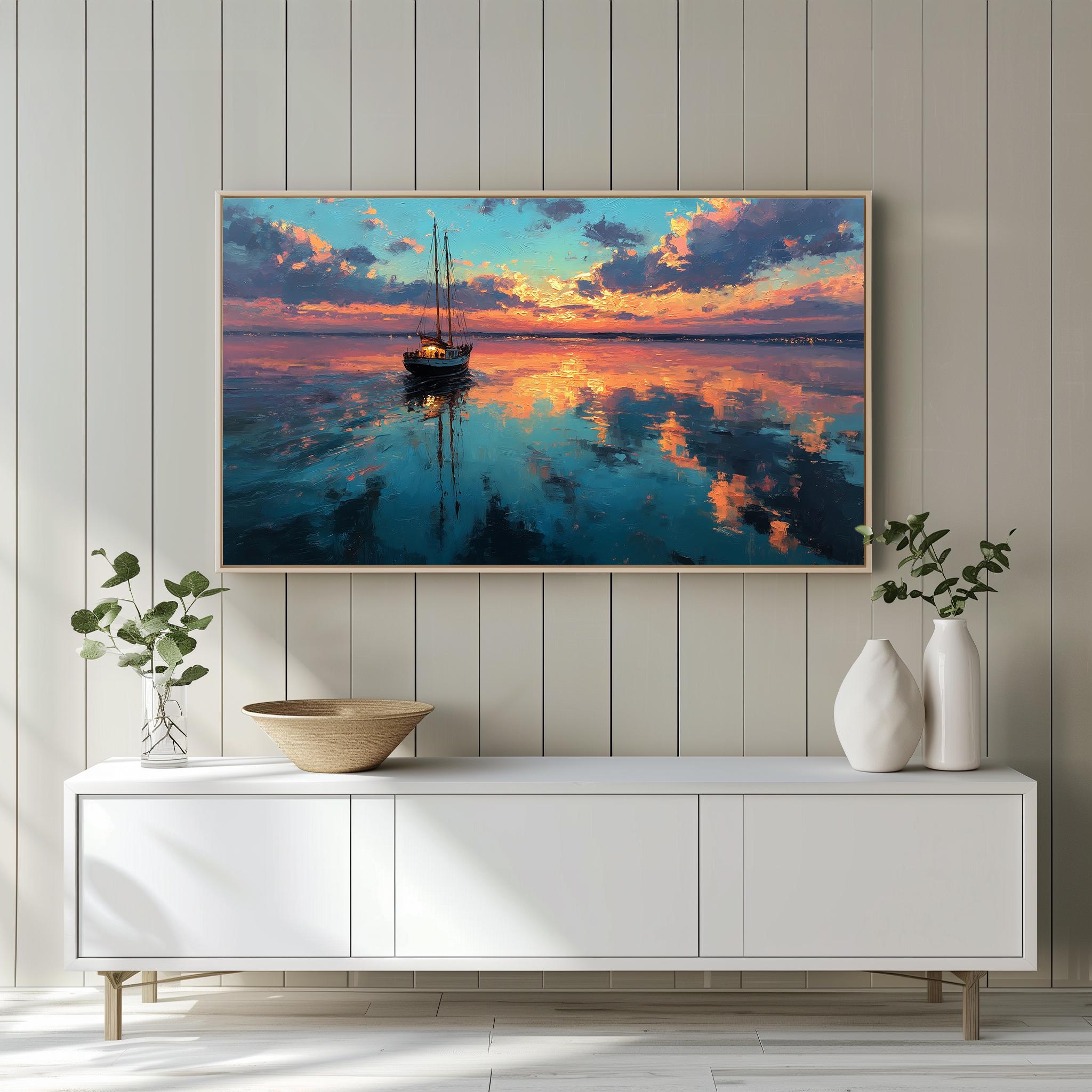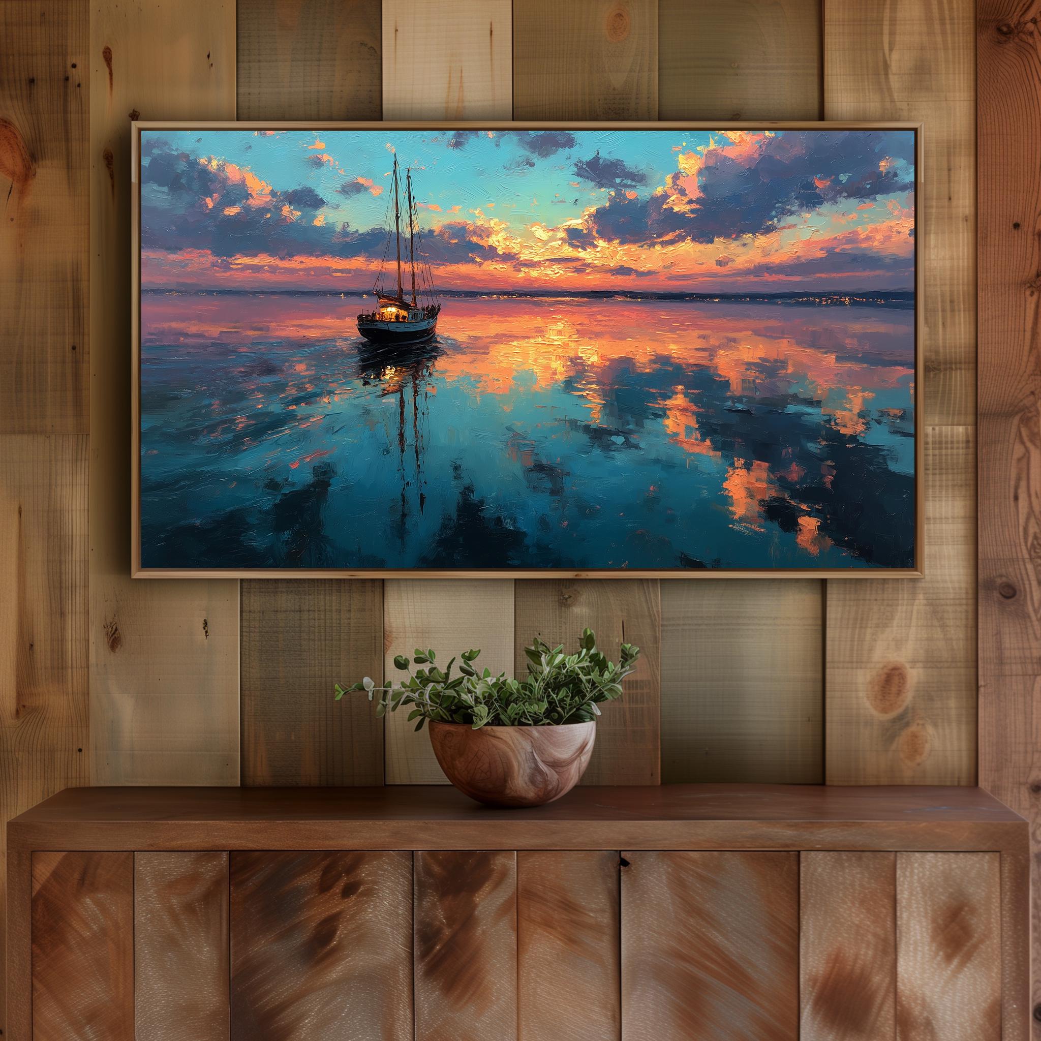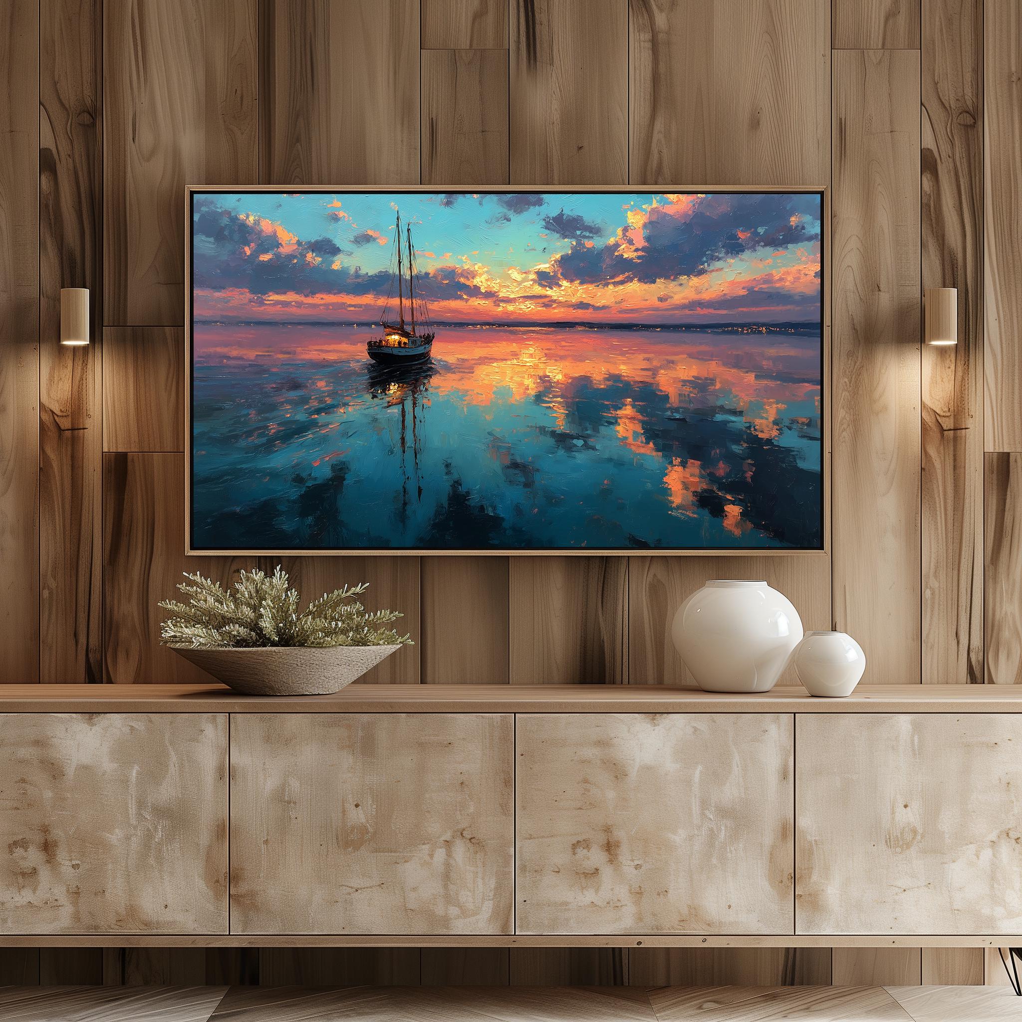 Sunset Sailboat Frame TV Art, Lake Scene Painting for TV, Tranquil Seascape TV Art, Cottage Decor, Summer Wall Art, Digital Download 394