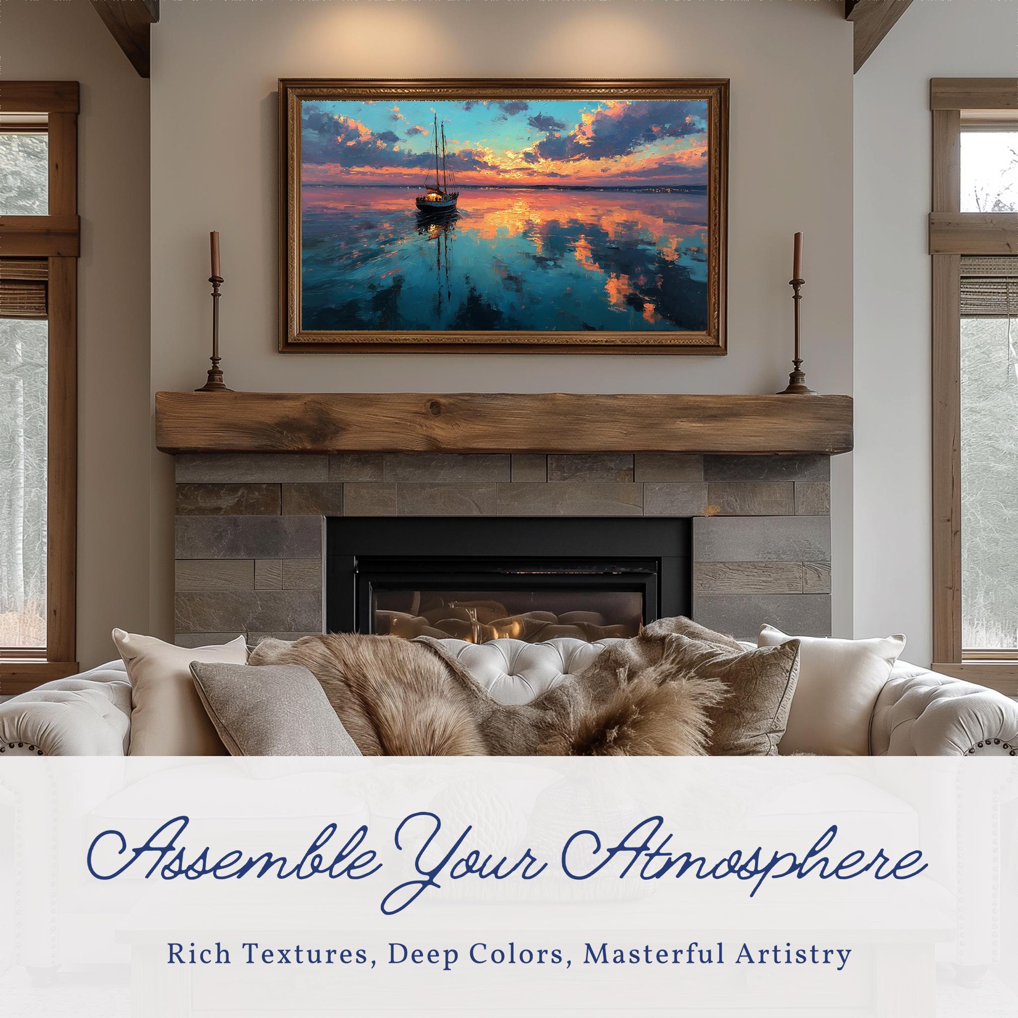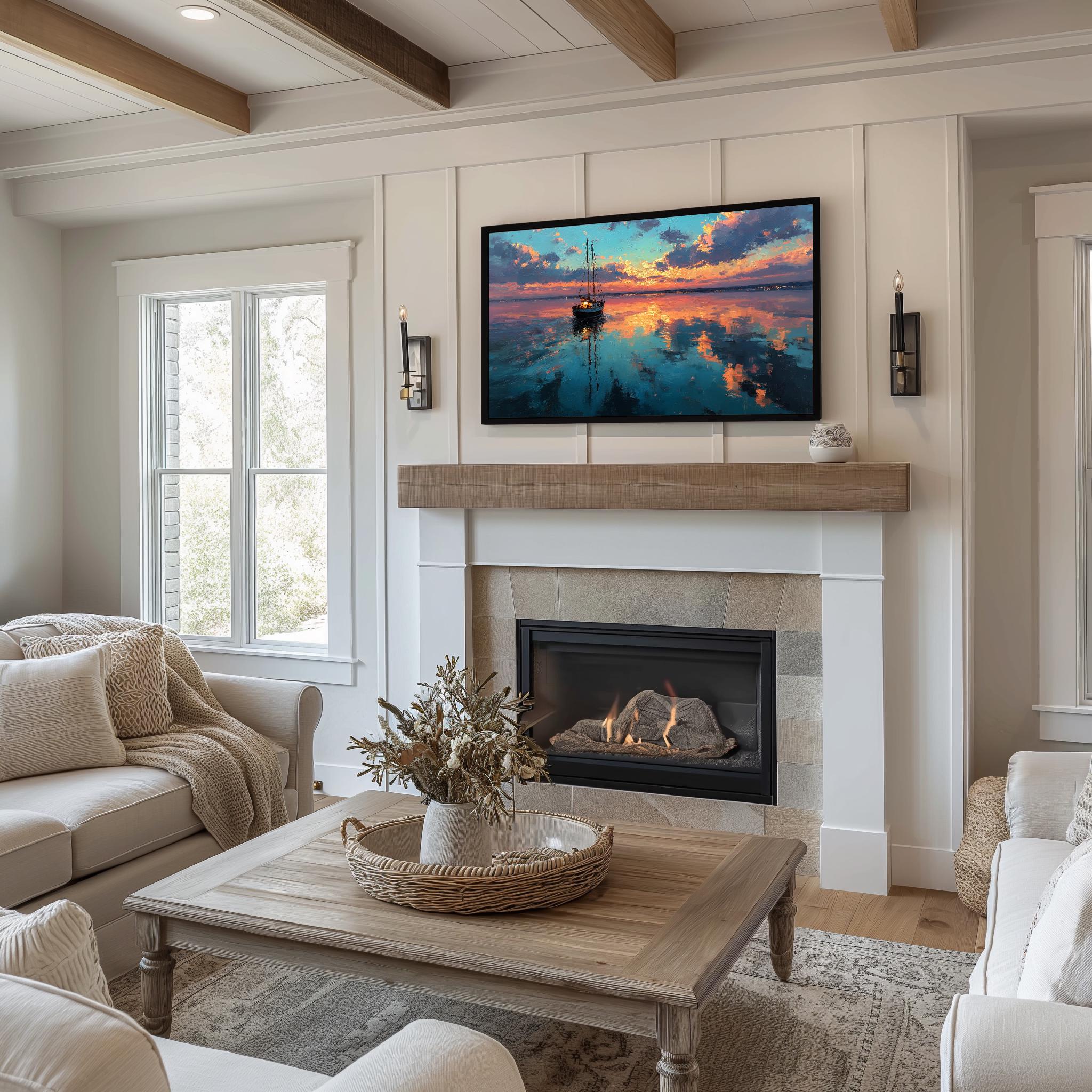 Sunset Sailboat Frame TV Art Immerse yourself in the tranquil beauty of a lake scene, where a sailboat glides gracefully under the warm hues of a setting sun. This digital download transforms your TV into a serene escape, bringing a touch of summer charm to your home decor. Perfect for cottage living or a beach house vibe, this artwork creates a peaceful atmosphere that invites relaxation and reflection. Summer