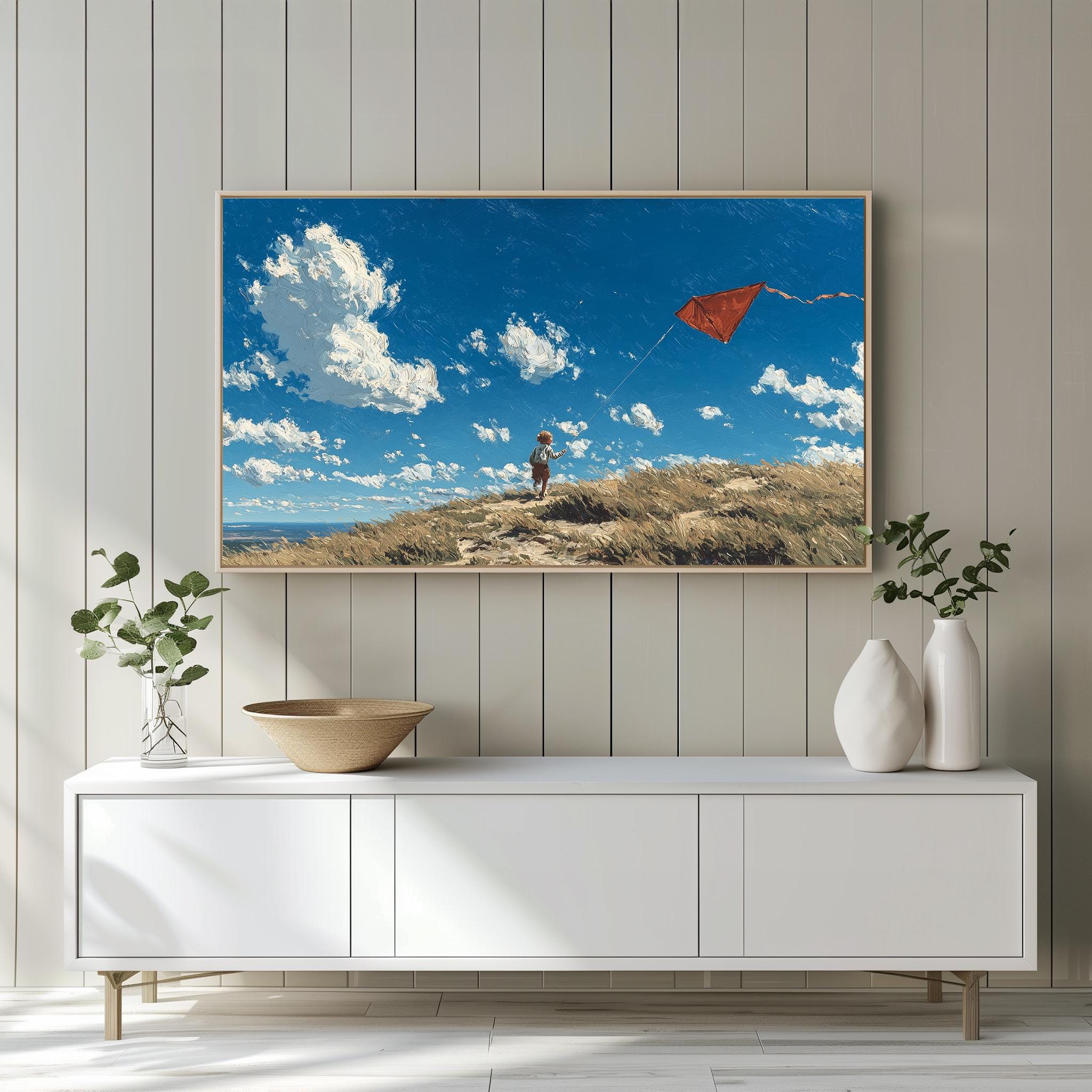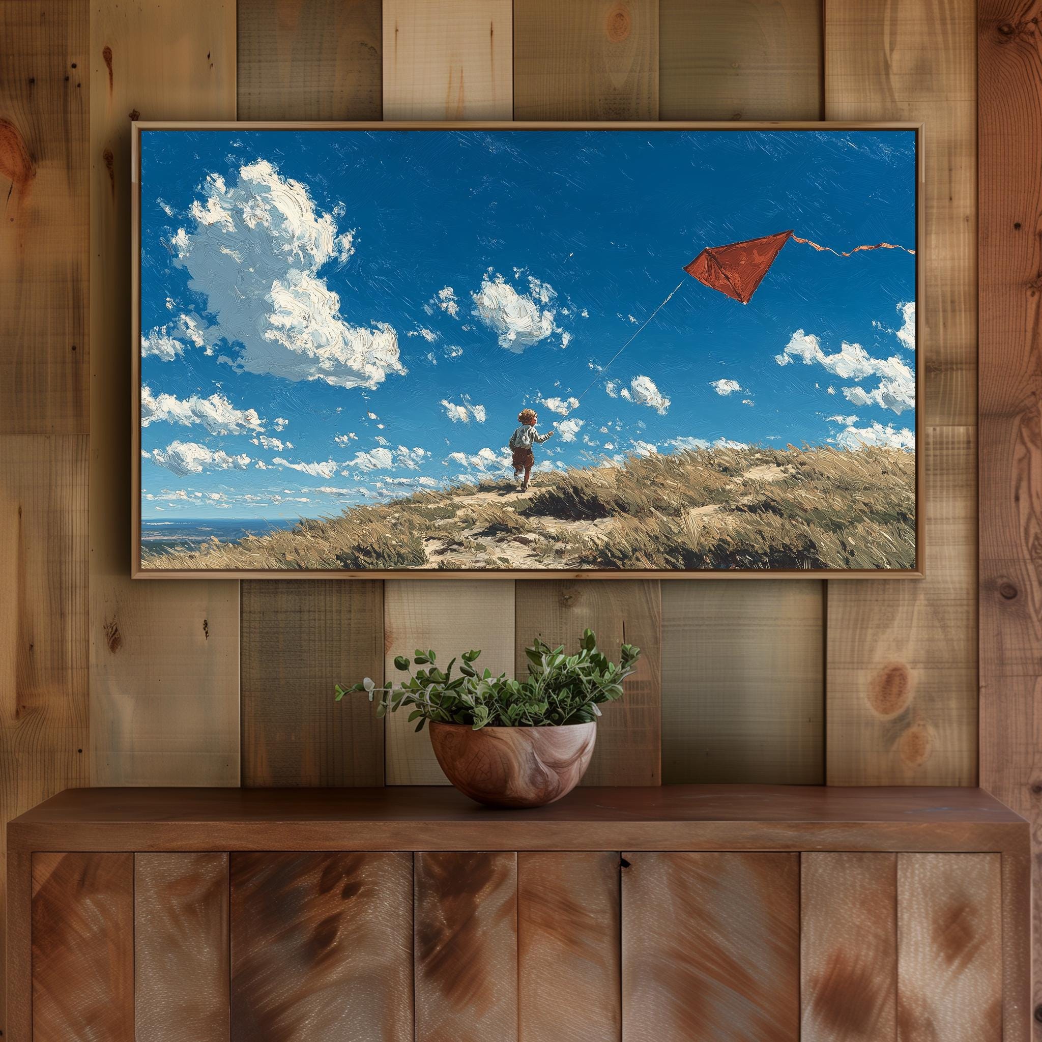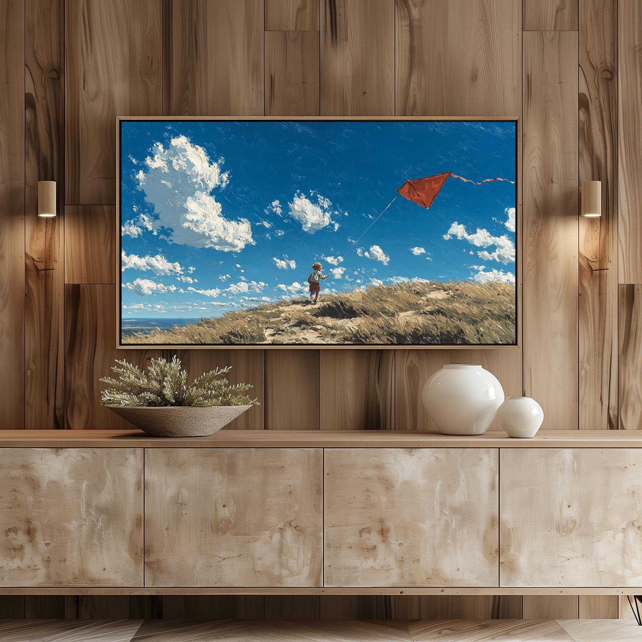 Rustic Hilltop Kite Frame TV Art This charming artwork captures a child joyfully flying a vibrant red kite against a backdrop of a serene, windy landscape. It’s perfect for adding a touch of rustic charm to your living room, evoking the spirit of countryside adventures and carefree childhood moments. Ideal for farmhouse decor enthusiasts, this digital download seamlessly enhances your home's aesthetic while providing a unique focal point for your Samsung TV. Perfect for spring and summer, when outdoor activities and playful moments come to life.