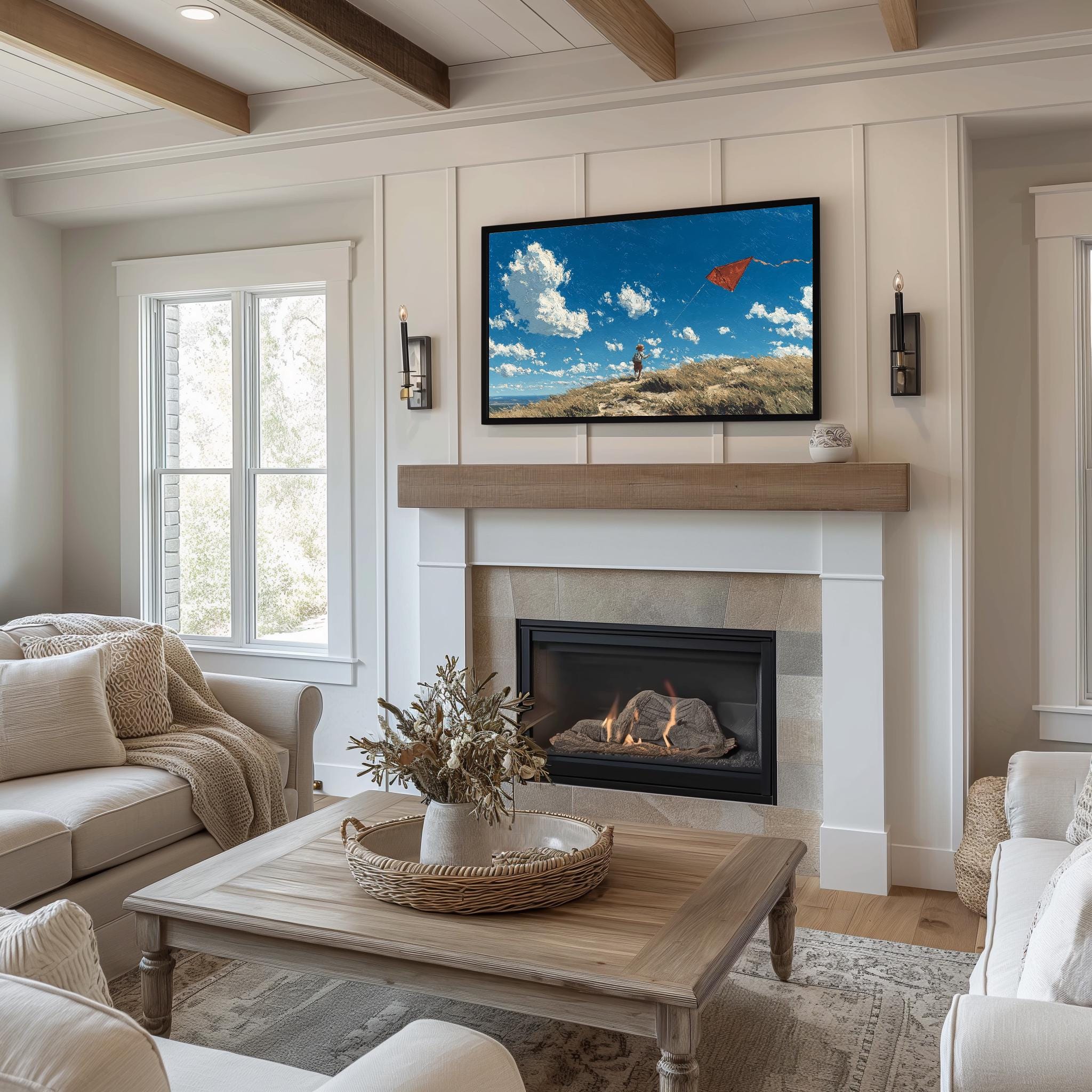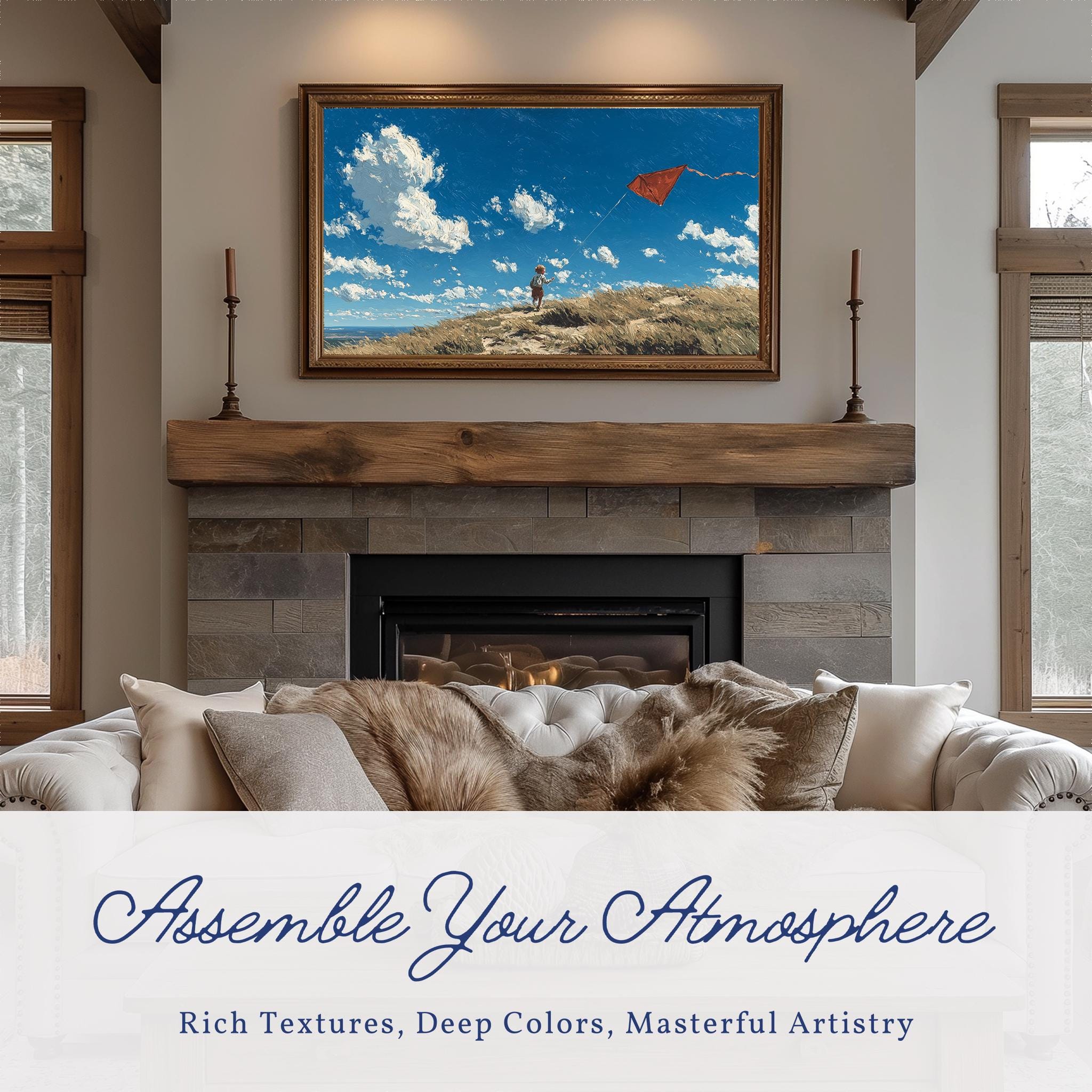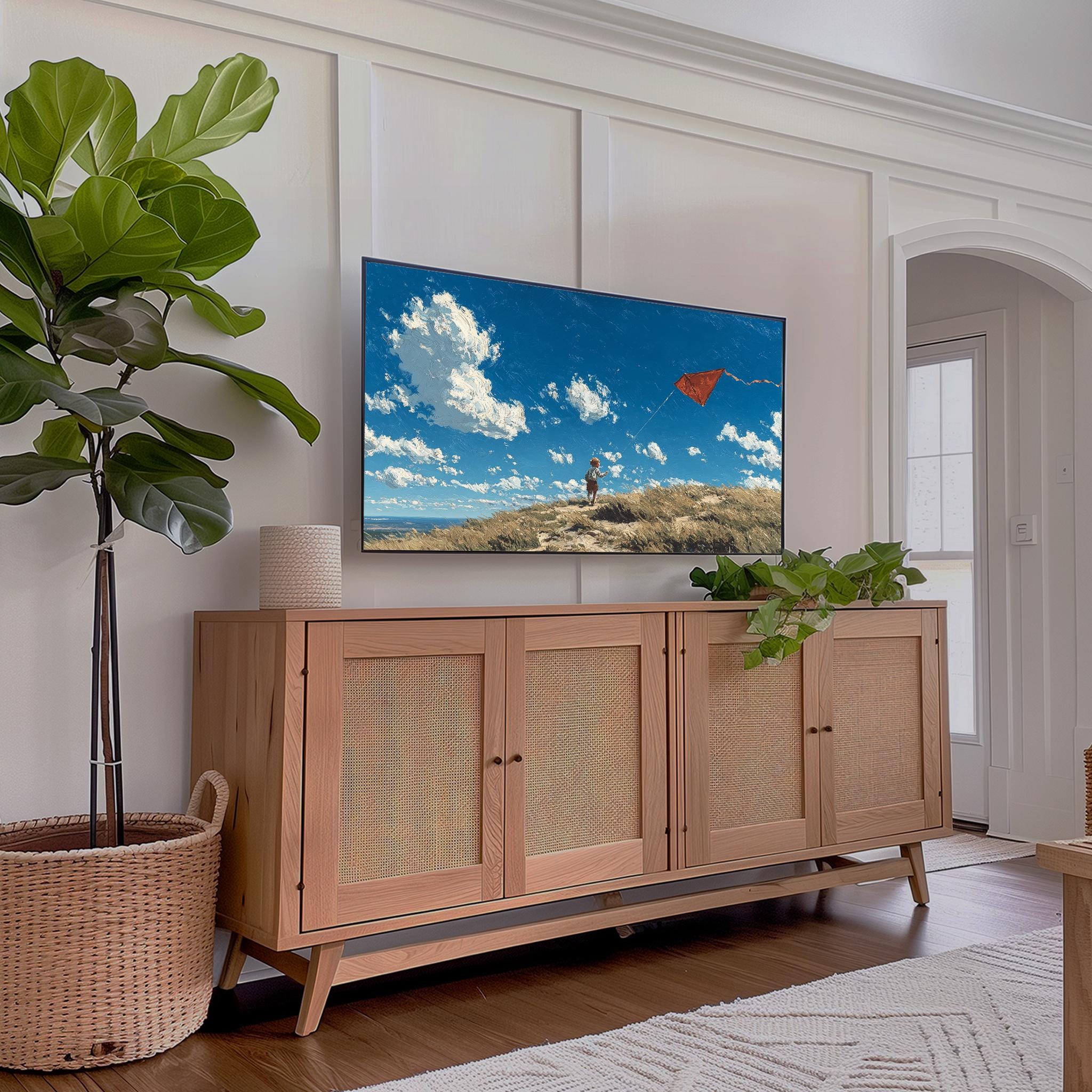 Rustic Hilltop Kite Frame TV Art This charming artwork captures a child joyfully flying a vibrant red kite against a backdrop of a serene, windy landscape. It’s perfect for adding a touch of rustic charm to your living room, evoking the spirit of countryside adventures and carefree childhood moments. Ideal for farmhouse decor enthusiasts, this digital download seamlessly enhances your home's aesthetic while providing a unique focal point for your Samsung TV. Perfect for spring and summer, when outdoor activities and playful moments come to life.